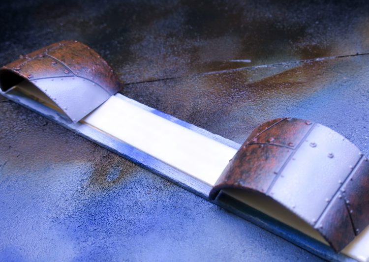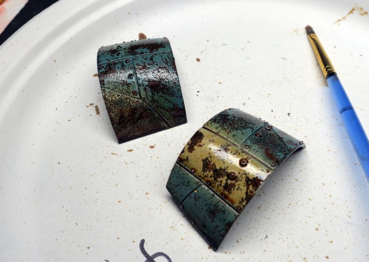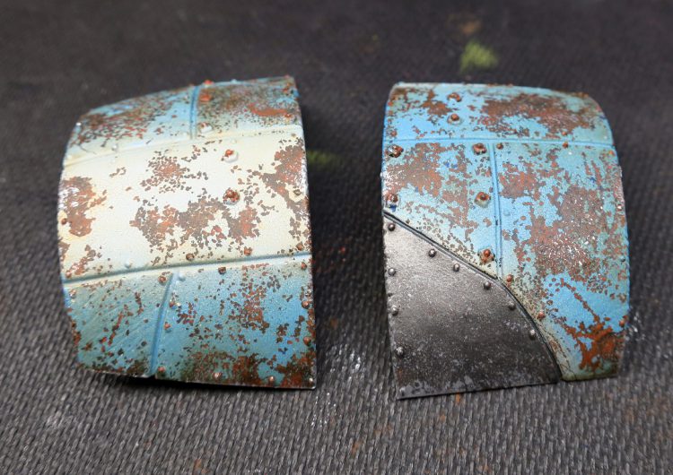 This technique will produce a cool looking effect, followed by an effect you don’t really like, followed by an end result that looks freaking cool. You have to be prepared to feel like you messed up, and still power through to the end. In this example, I’ll be doing two stompa shoulder armor plates to show how different it can turn out on exactly the same piece of kit, and exactly the same technique (even done simultaneously). I recommend duplicating armor plates if this is your first time (I do this almost every time I use this technique, so I can pick my favorite to use)