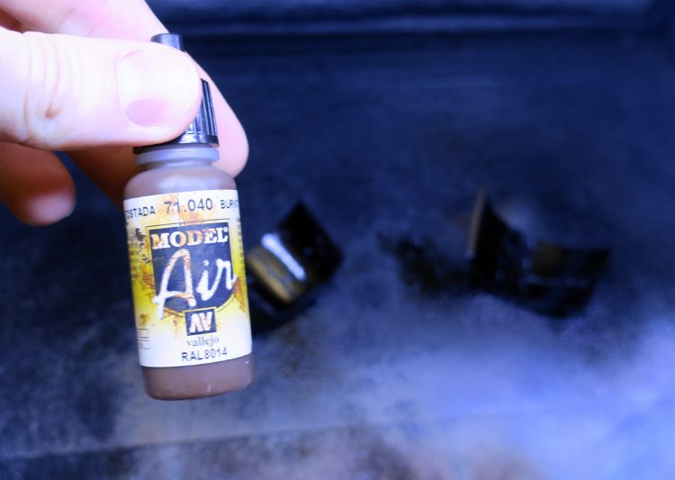 Base coat the armor plates in vallejo air BURNT UMBER. This is a lovely base color which gives us our dark chips. Make sure to get all the sides.