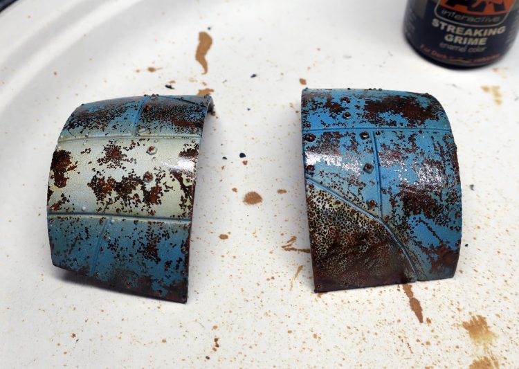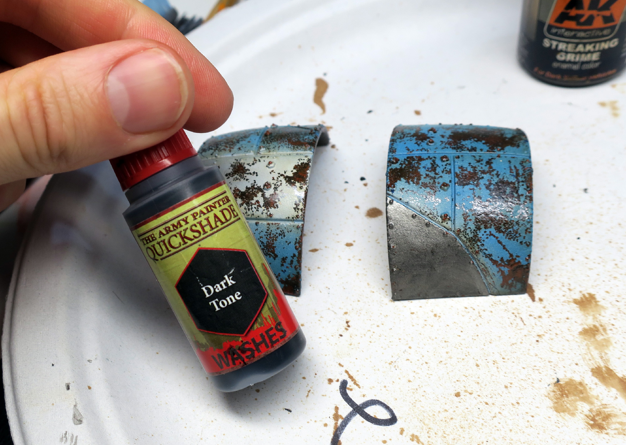 For rust I like using watered down Skrag, no need to get fancy when thinning it either just plan water is fine. I usually push the rust towards the bottom of areas to help create a gradient and make the clean areas really pop.