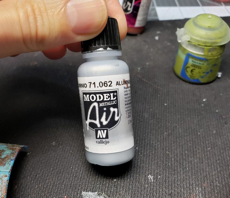 After the varnish has dried, I come back with a sponge with vallejo aluminum air, and chip the edges and some of the larger chips to indicate where fresh metal has been exposed. Adds another layer of variety and interest to the model, and really catches the eye in person.