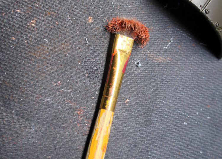 Get a really crappy brush...i mean seriously crappy. You can see my magical weathering brush photo’d here. It’s an absolute mess. I have no idea how it got this way, but it's so perfect for this technique. Using BEASTLY BROWN, dip the brush in the paint, and wipe off the excess. Then stipple the paint onto the armor. I like to wear gloves during this, as I can use my fingers to adjust the paint if I get it on too thick in one spot, and this just heightens the effect. Let the paint dry before the next step.
