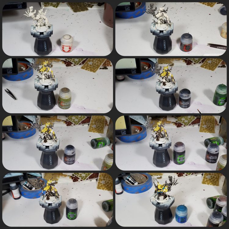 I forgot to take a picture of it, but the switch between Skrag and Averland was a bit too obvious, so I toned it down by going in between with a 1:1 mix of the two. I also managed to get one of the paints hidden, that one is Xereus Purple.