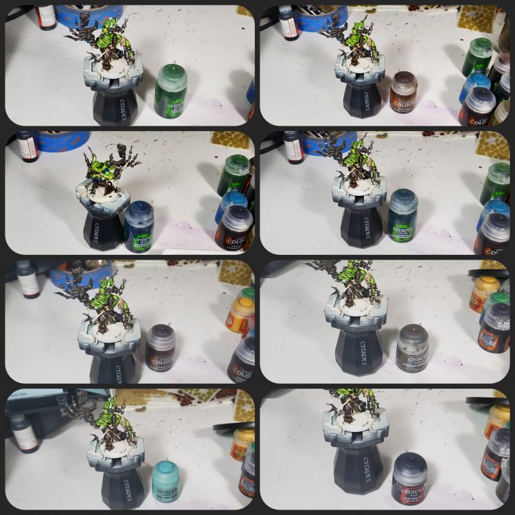 I chose to apply these two colours using my airbrush, applying the green in a Zenithal highlight; this made the green transition from my shadows without much work and allowed me to achieve a nicely blended look, although this would be achievable by hand with some more time spent on this stage. I also did apply a tidy up coat of this green to reinforce this colour, although this wasn’t strictly necessary as the main highlights would do this anyway.