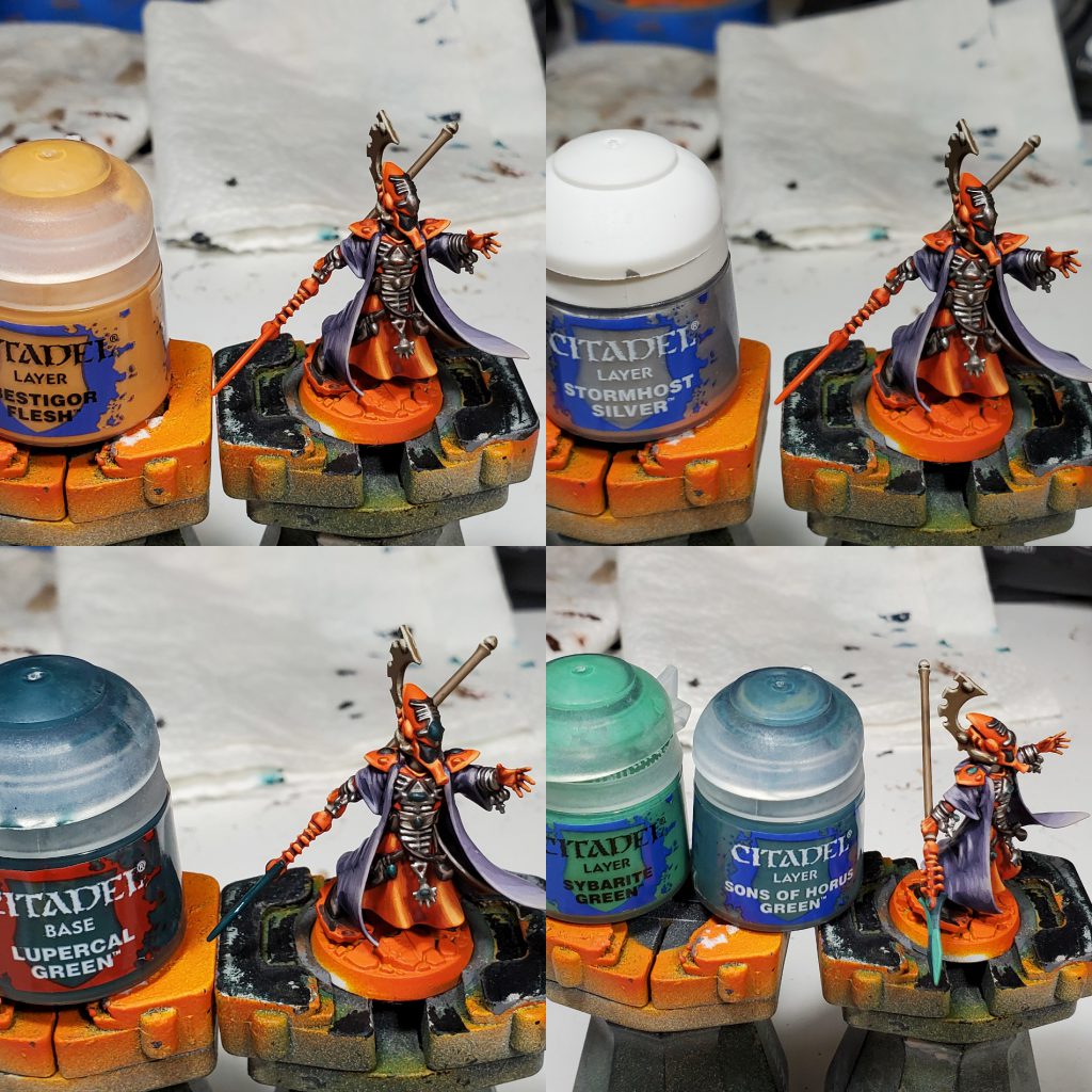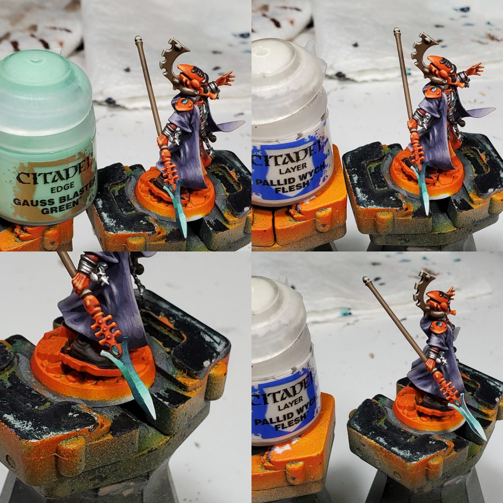 I forgot to take a separate picture for Sybarite and Sons of Horus here they are not mixed at this stage, for the blade/gems I was pretty concerned about getting the size of the transition correct so I just block in the main colours to start with.