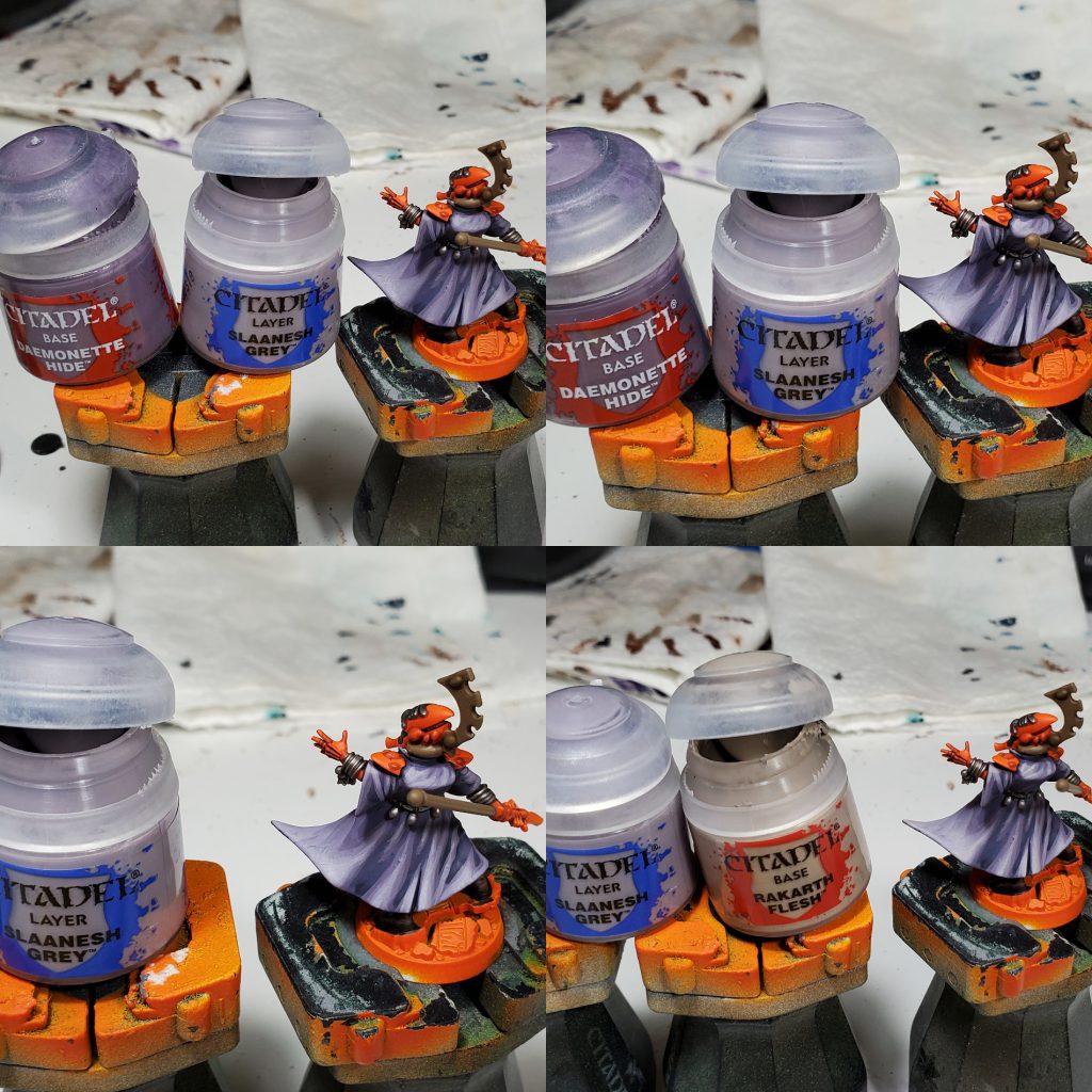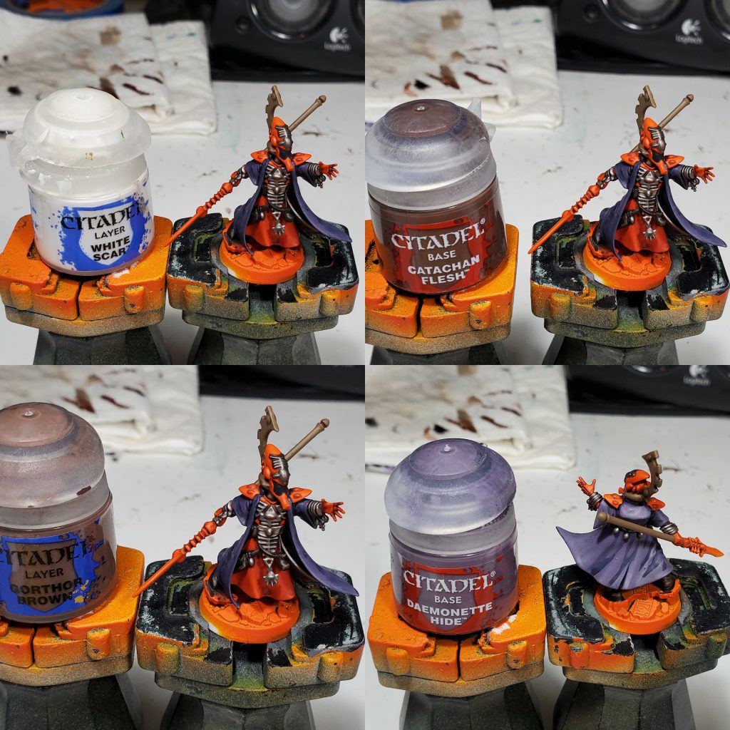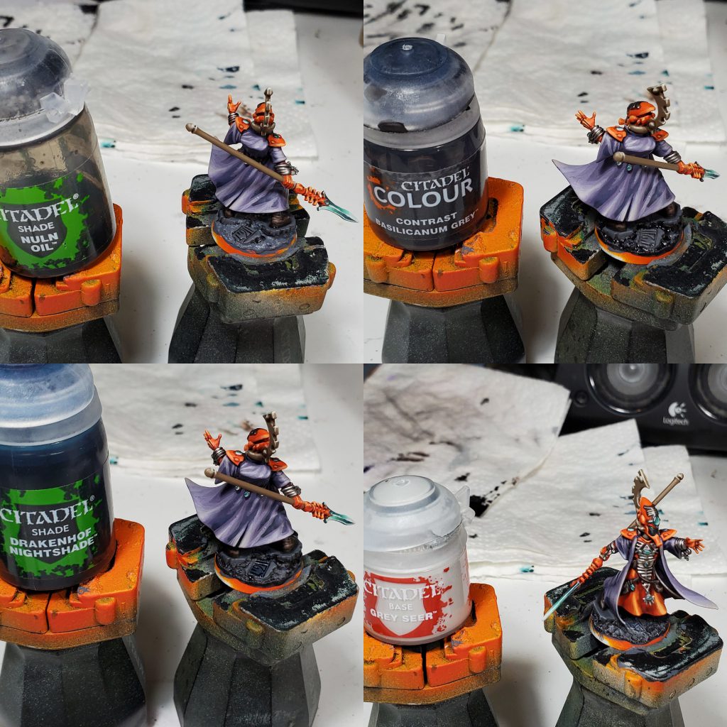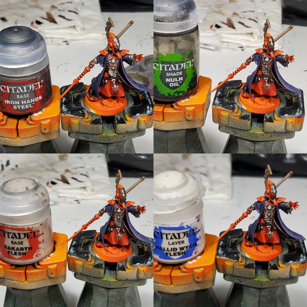 Normally I use something like basilicanum on metals, but I wanted a very clean and bright silver metal which nuln over iron hands steel gave nicely. Note that you could skip the rakarth highlight on the cloth as it is fairly subtle in the final result.