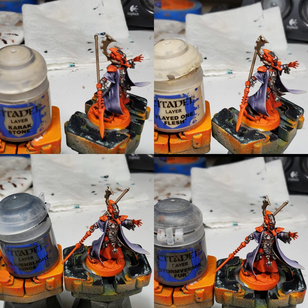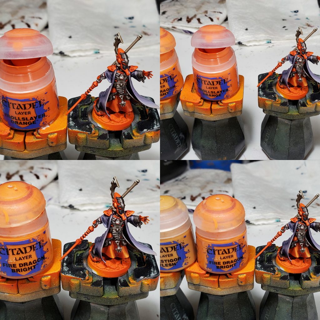 For the orange robes I slowly stepped colours up similarly to the cloak, but for the armor I only used Fire Dragon Bright and Bestigor Flesh for simplicity.
