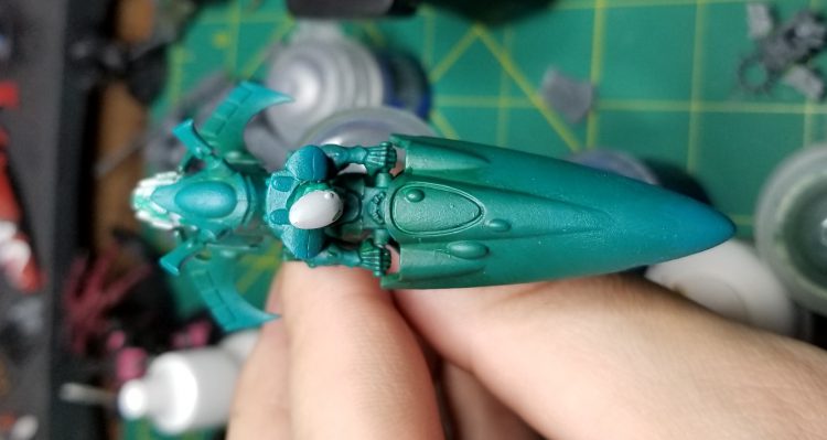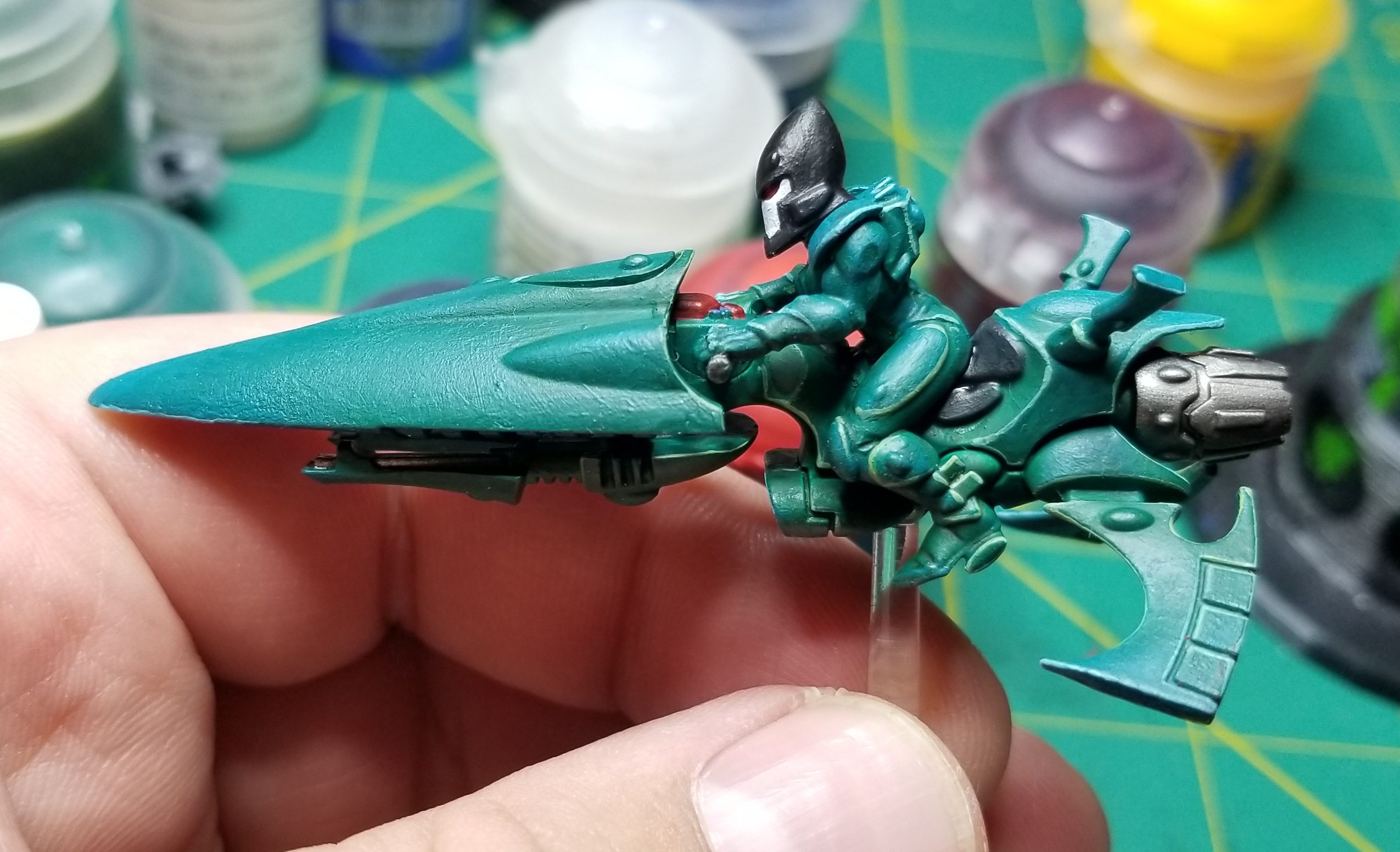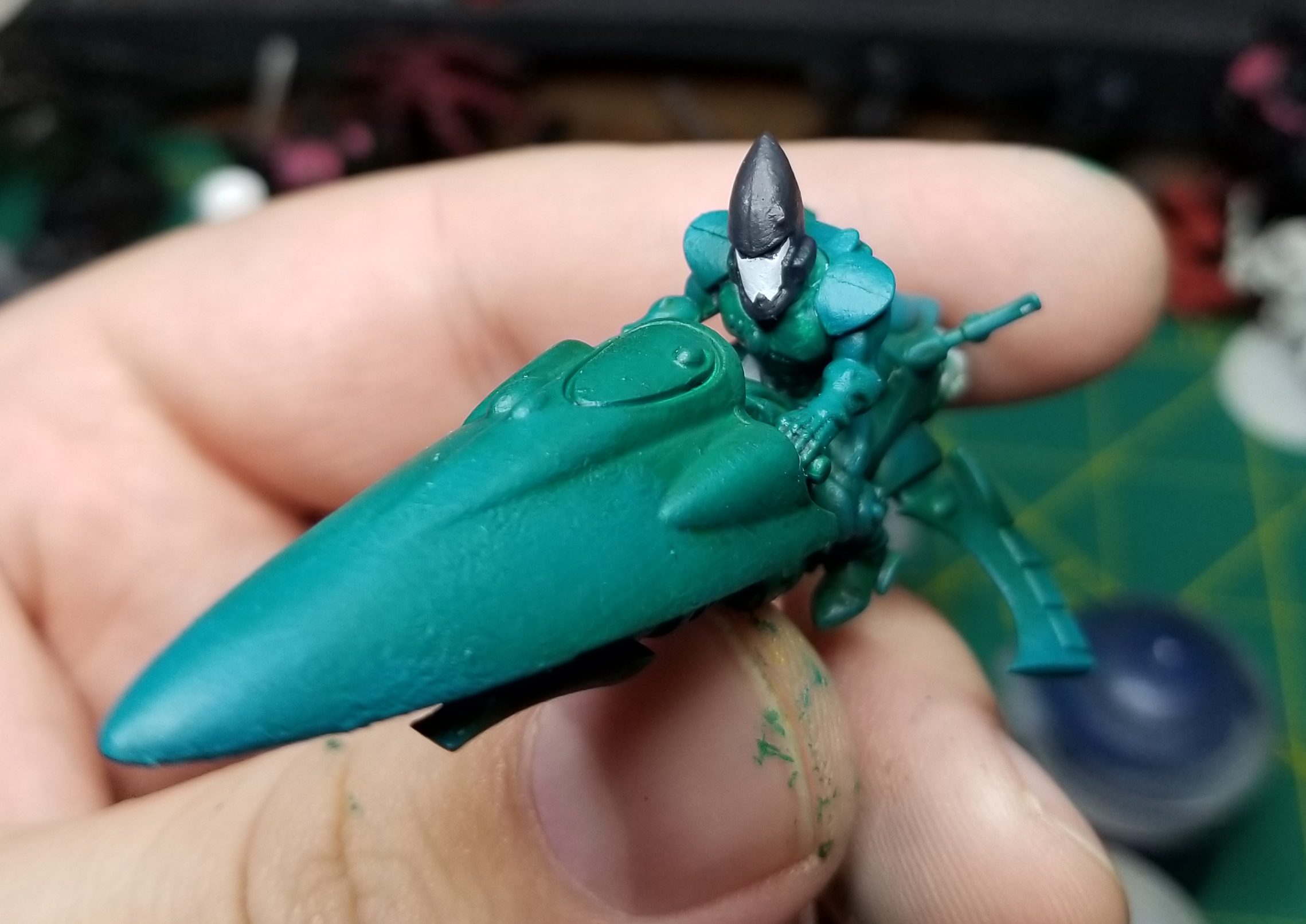 I then mixed a little bit of Baharroth Blue in with the Sotek Green to do some final highlights and worked some highlight lines along the middle of the jetbike's nose, to get a lighter blue effect. I did similar blends/fades on the rider's armor and the back of the bike and the fins. I was pretty pleased with this result, so I decided to move on to some of the other details.