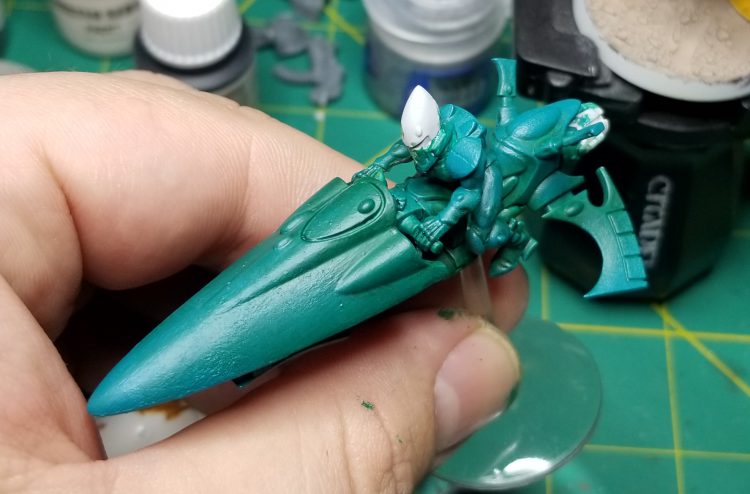 I don't have all the same thoughts about Mymeara as Rob, just that I don't have much that's painted blue/green and it would look cool. With an airbrush it paints up incredibly quickly, and stands out well on the battlefield. I'm only going to cover painting the main armor color here, the rest of the model is "standard" colors that are covered in a myriad of different ways elsewhere. I'd keep heads separate while painting to make painting black without getting it on the blue easier, but it'll work fine either way.