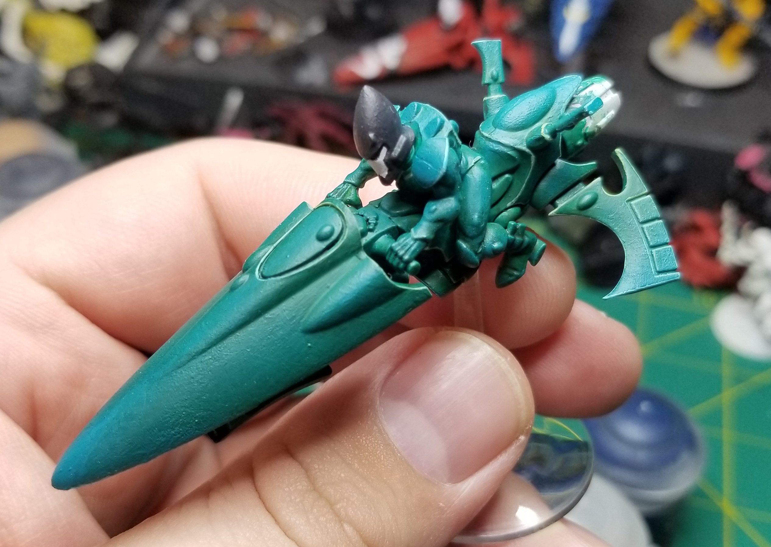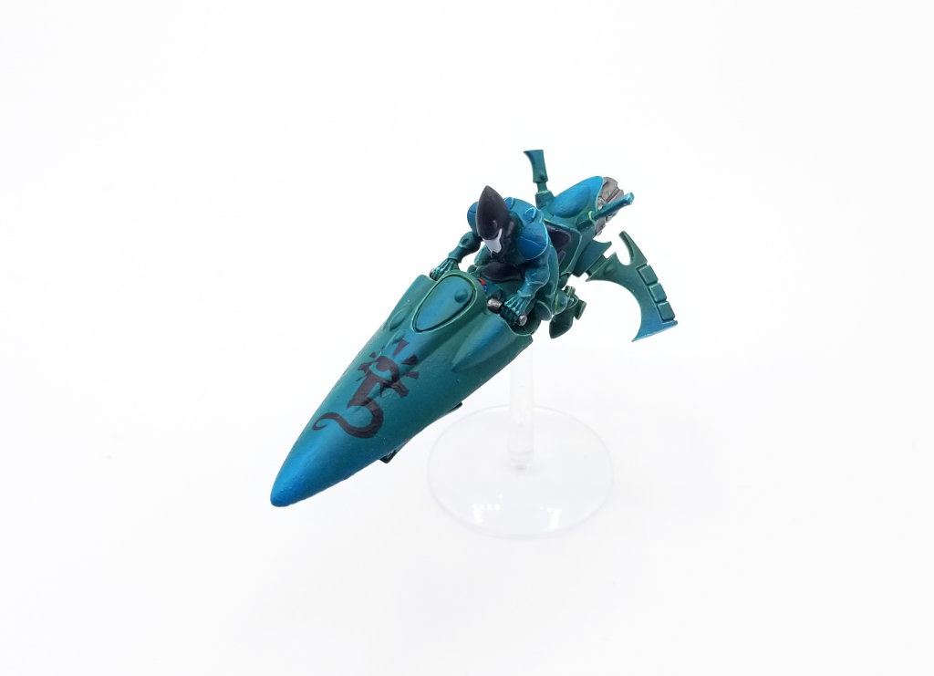The end result works pretty well. I finished off the final details by doing red gemstones for the little dashboard screen, Corvus Black for the seat, and the engine and handlebars are just Leadbelcher with a Nuln Oil wash. The end result is something I'm pretty happy with and reasonable enough that you coudl do it on a full army without hating yourself. The last step is freehanding the Mymeara icon, which I was happy to do after futzing around with transfers on the other Eldar models I painted recently (I hate transfers).
