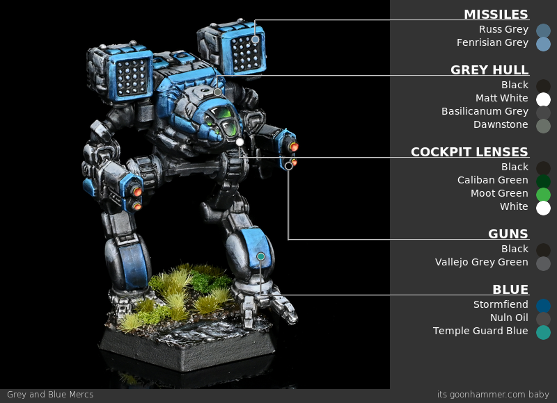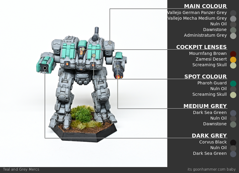 It’s honestly a pretty basic scheme, with only two main colours, but it's got enough to be interesting and very readable details so it works out as being a bit more then the sum of its parts. This in turn does mean that the recipe starts off simple - prime the model with a dark grey/black primer and then a zenithal of Mecha Medium Grey, and you’ve got the base for the main part of the scheme. I’ve used a few different initial primers; lately I’ve been using Vallejo Panzer Grey, but pretty much any neutral dark grey works. After that I do all the basecoats in one pass before drowning the whole model in thinned