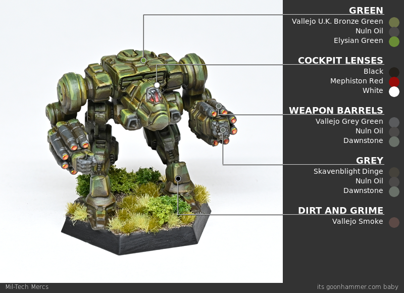 Dryad Bark in the ‘transition’ part of the recipe is thinned into a recess shade on the legs. This is an example of one angle of how you can paint black or other very dark colours. Since it’s difficult to get a differentiable wash or recess shade against very dark colours, you can instead use a lighter dirt or other environmental colour to point out the recesses to the viewer. It’s a relatively natural looking approach but can trip you up if you don’t account for having the rest of the model similarly dirty, in this case I could cheat and leave it mostly just on the lower legs since you can logically expect those areas to be dirtier then the rest of the mech and we already have a colour transition occurring.