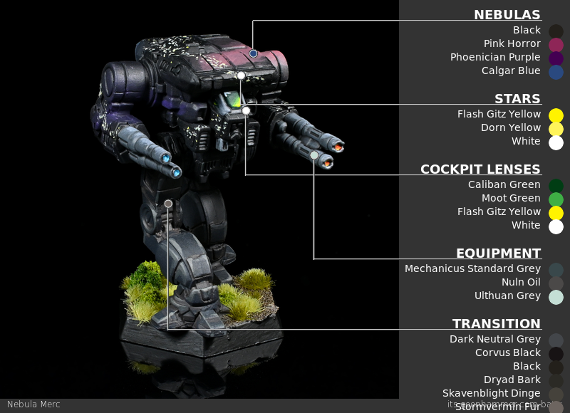 I believe I originally intended this to be a canon clan scheme, as I knew there were a few clans that had nebula themes on some of their units, but I think I ended up not being into any of them in particular and just did my own thing. I'm not sure I'd suggest doing a substantial number of mechs in this scheme as it is rather high effort as these things go, but it was a fun one-off project done as a challenge from our Patreon server!