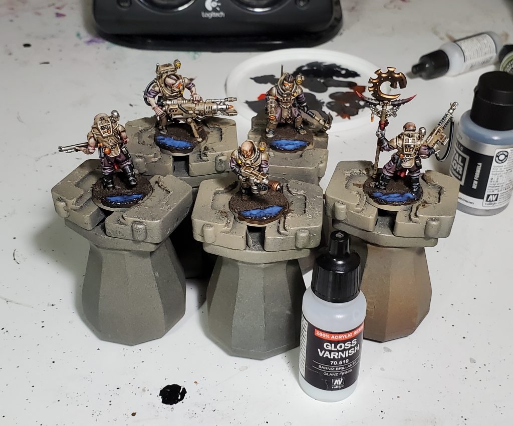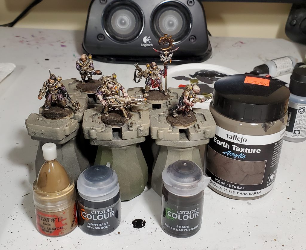 For the bases, I start by hucking a bunch of vallejo dark earth on in a nice thickish coat, for the river/lake I pressed the paste back in a few areas to create lower areas and you can exaggerate this by building a bank up a little bit. Once that dried I put wyldwood on the river/lake and agrax on the rest of the base, then I drybrush everything but the river with steel legion. Then I varnish the models with matte varnish, for this I am pretty happy with either Vallejo Mecha Matte or Premium Air Matte.