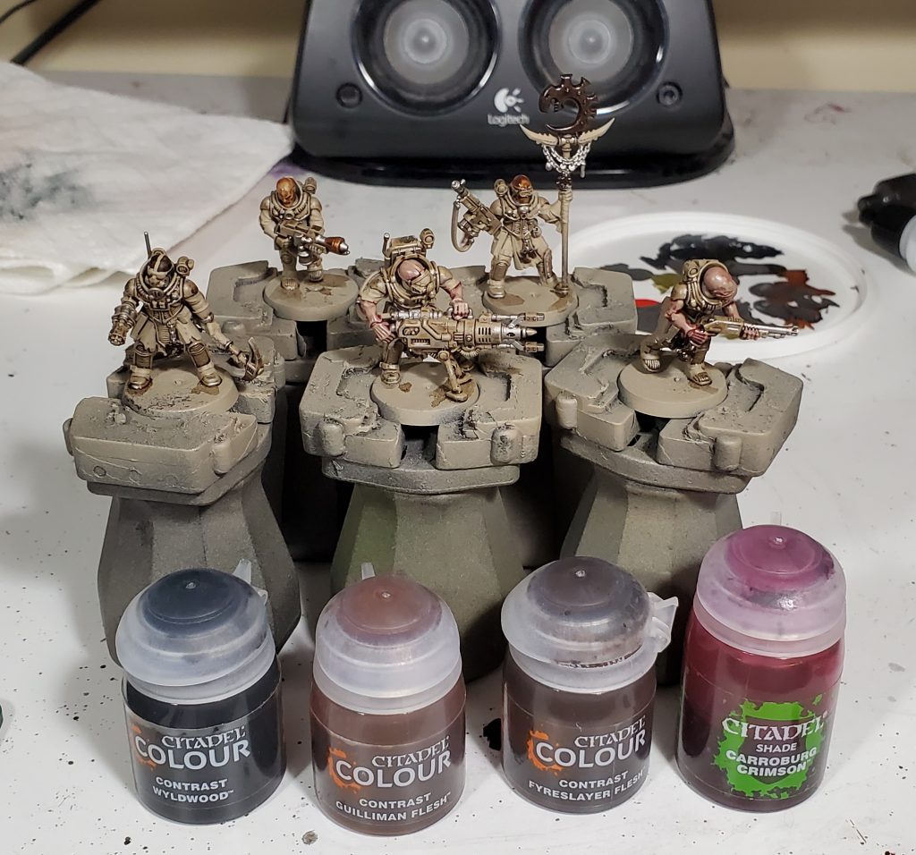 The first round of base coats are for the skin, and this is pretty much what you can see. I used Carroburg on the more evidently Tyranid hybrids and then various flesh contrasts for the more human range skin tones.