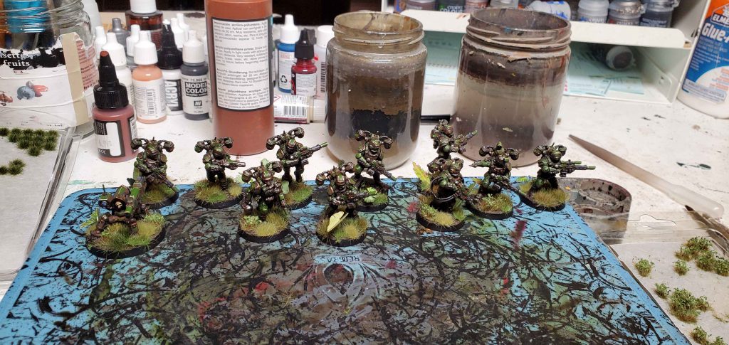 With that the infantry just need the bases finished off, I use vallejo dark earth washed with agrax then completely drown the base in various tufts once the varnish is on. Currently I am using this pile of gamers grass tufts and laser-cut plants: