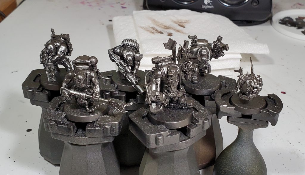 With the number of small metallic details on these models I like starting with that for the initial colour with the airbrush, I have been using Vallejo Metal Color Exhaust Manifold for this but you can probably take your pick of Citadel metals or a metal rattle can primer instead.