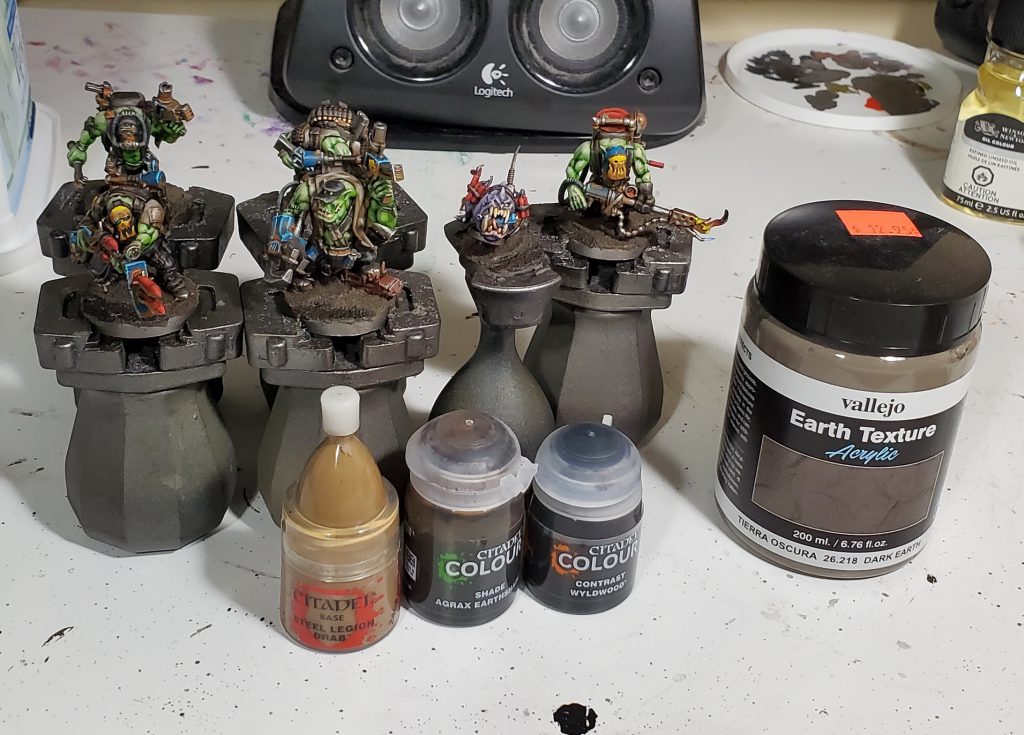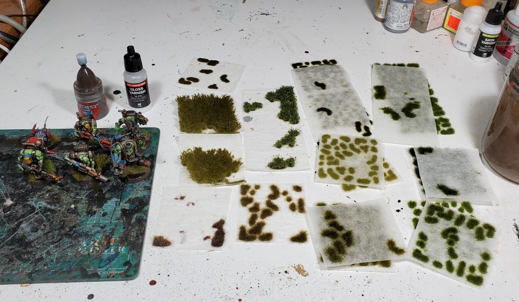 The bases get covered in Dark Earth with some slightly pressed down to form the river/lake, then once it's dry the banks get washed Agrax and the bed Wyldwood before a drybrush of Steel Legion. I usually varnish once I finish the bases to avoid having to re-gloss the river or having tufts go funny looking, for that I have been using Vallejo Premium Air lately but Mecha Matte is good too.