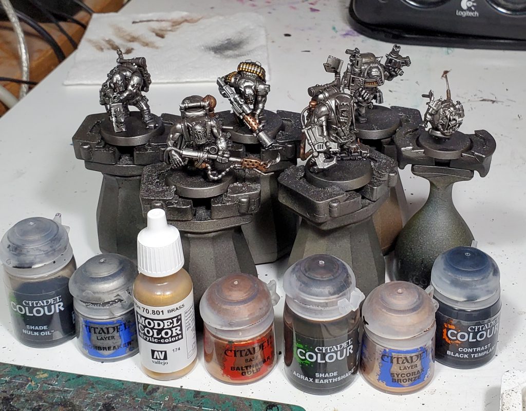 If you want to cut out a few coats you could do the copper with Gore-Grunta and the brass with Snakebite over the base steel, it will save you a not insubstantial amount of time!