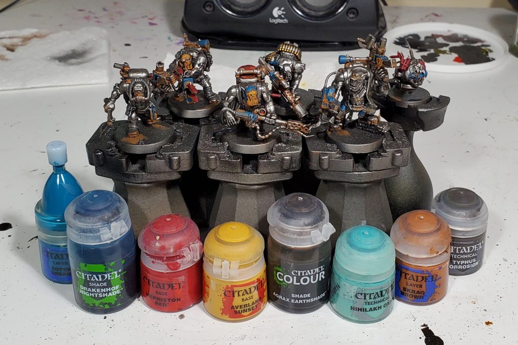For verdigris, I usually water down the Nihilakh a moderate amount as its too intense straight for my taste. The rust is just super watered down Skrag, it should be similar to a wash in consistency, but without a surface tension breaker its not really one. Once thinned it is placed approximately towards the bottom of panels, if you have it thin enough it will mostly settle appropriately. Note that I left the Skrag off stuff like dynamite that wouldn't rust, but should still be a secondary colour.