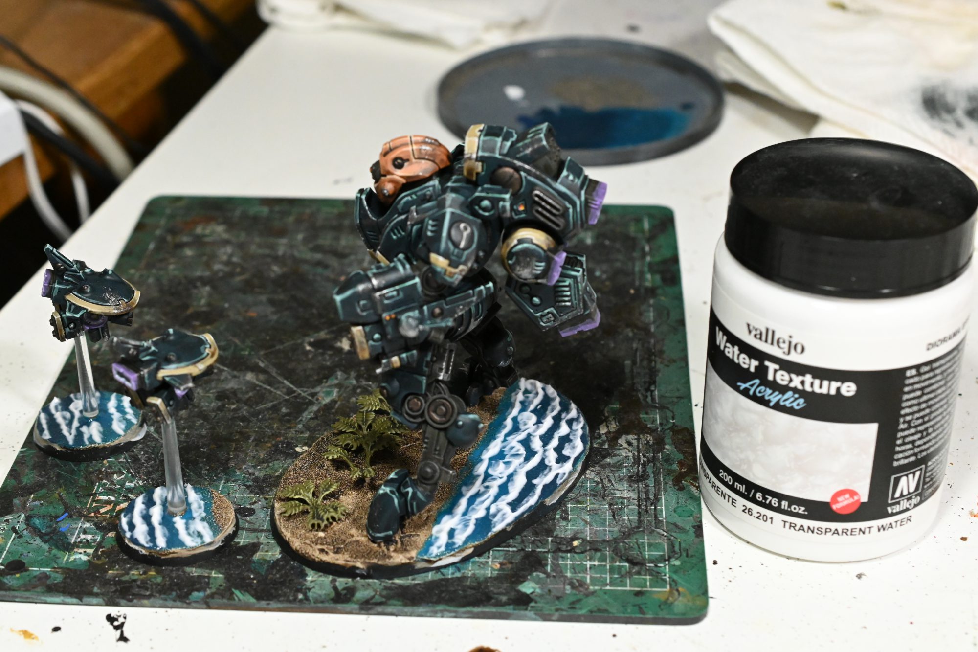 Give the water a few hours to dry before sculpting the waves onto the water with the confusingly similarly named Transparent Water texture with a little spatula, I like using the GW one and just covering the back of the wide end with the texture paste and then dabbing it down onto the surface of the water and lifting up with a bit of rotation to the motion. Despite their claims, I have found this stuff doesn't dry quite clear when there is any significant amounts, which isn't really a problem in this case but is something to watch out for.