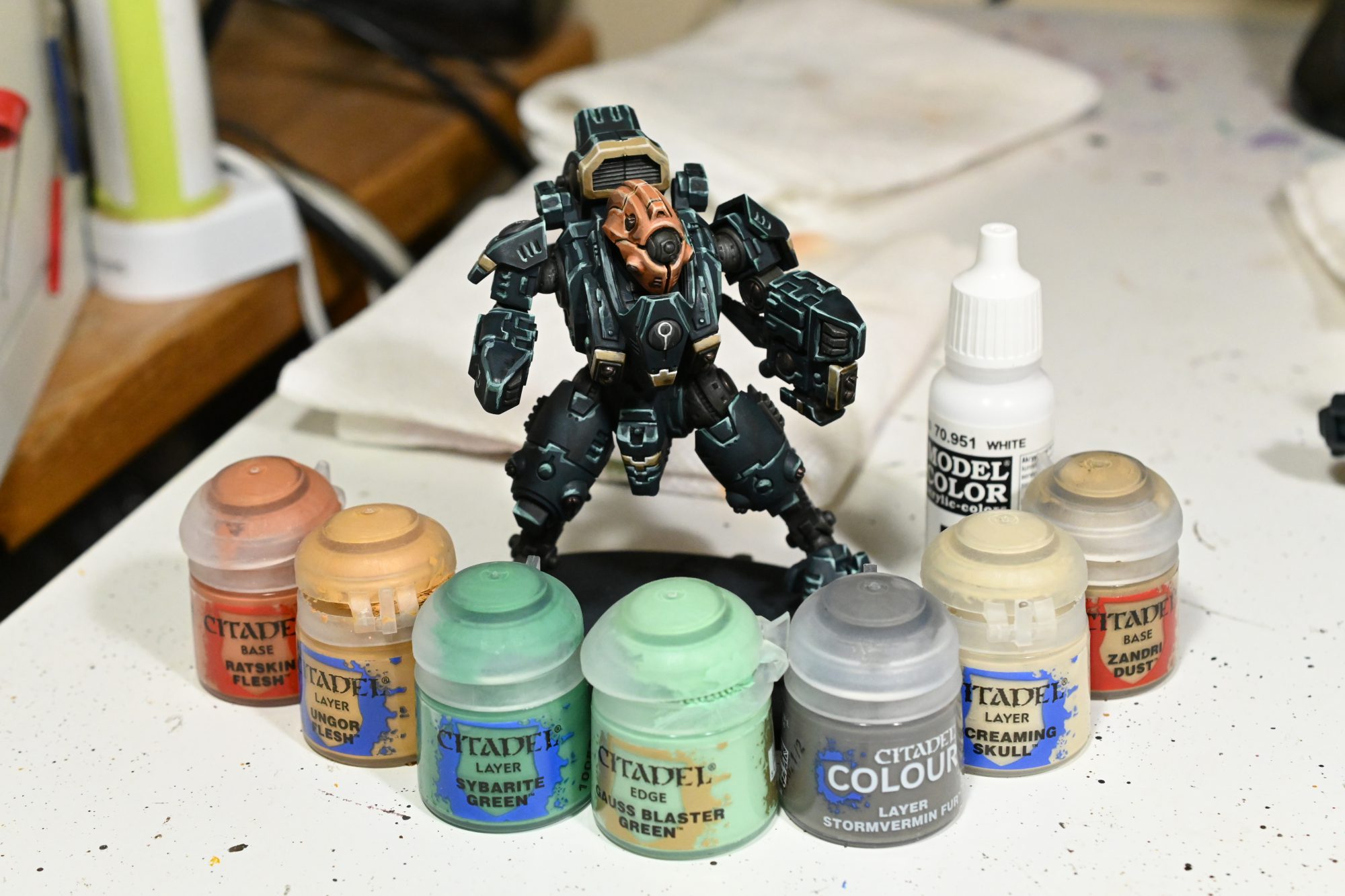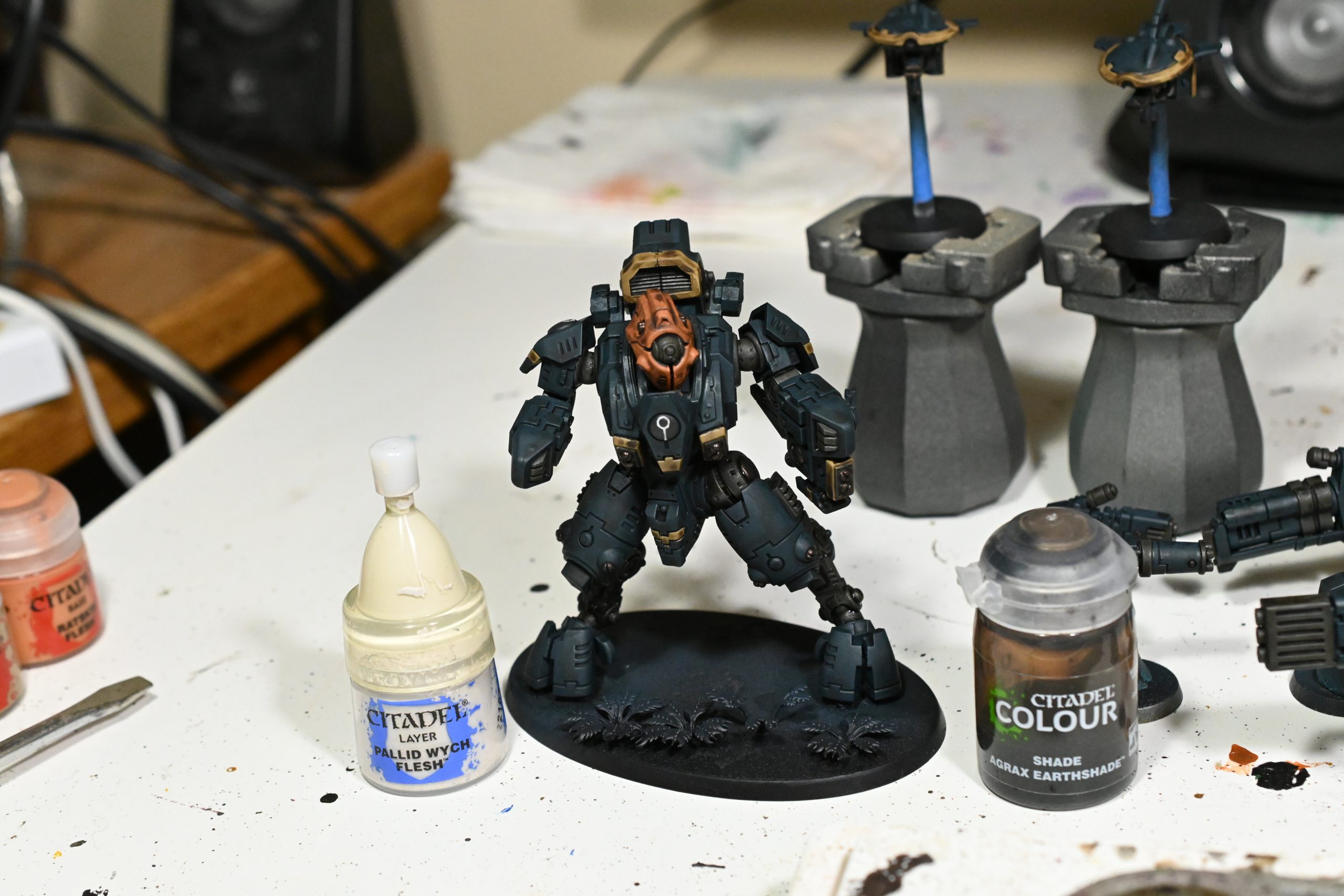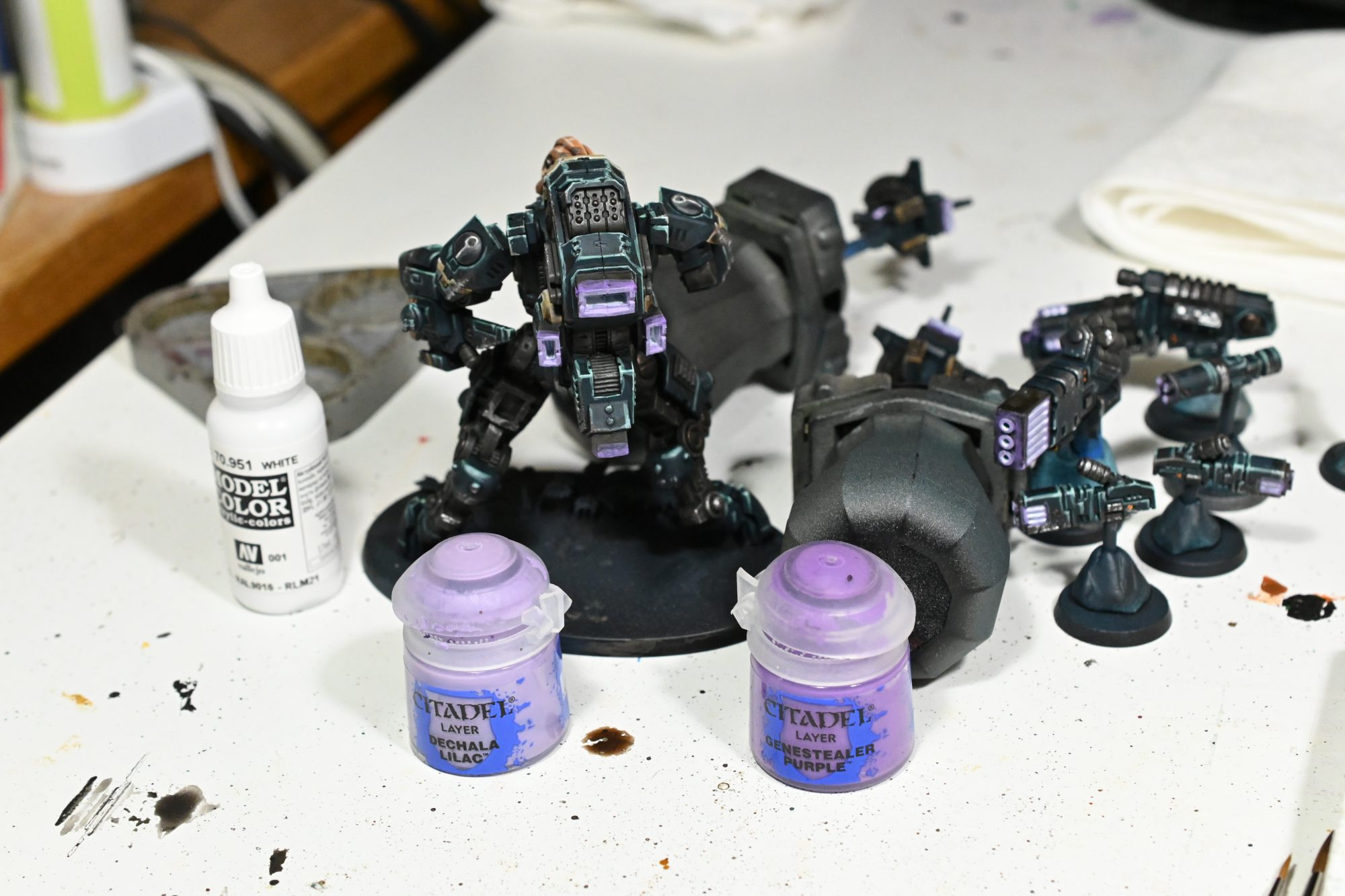 The glow I did is honestly the crudest part of the whole scheme, but tau have a absolute ton of it going on and anything more complex drives me insane. I do the colours in a slightly odd order, I start by covering the surrounding/illuminated surfaces in a fairly thin coat of genestealer purple, after that I water down the white a moderate amount and fill in the sources of illumination before going between the two colours with a band of Dechala. This helps hide mistakes with the purple or white and minimizes having to be precise with any given colour.