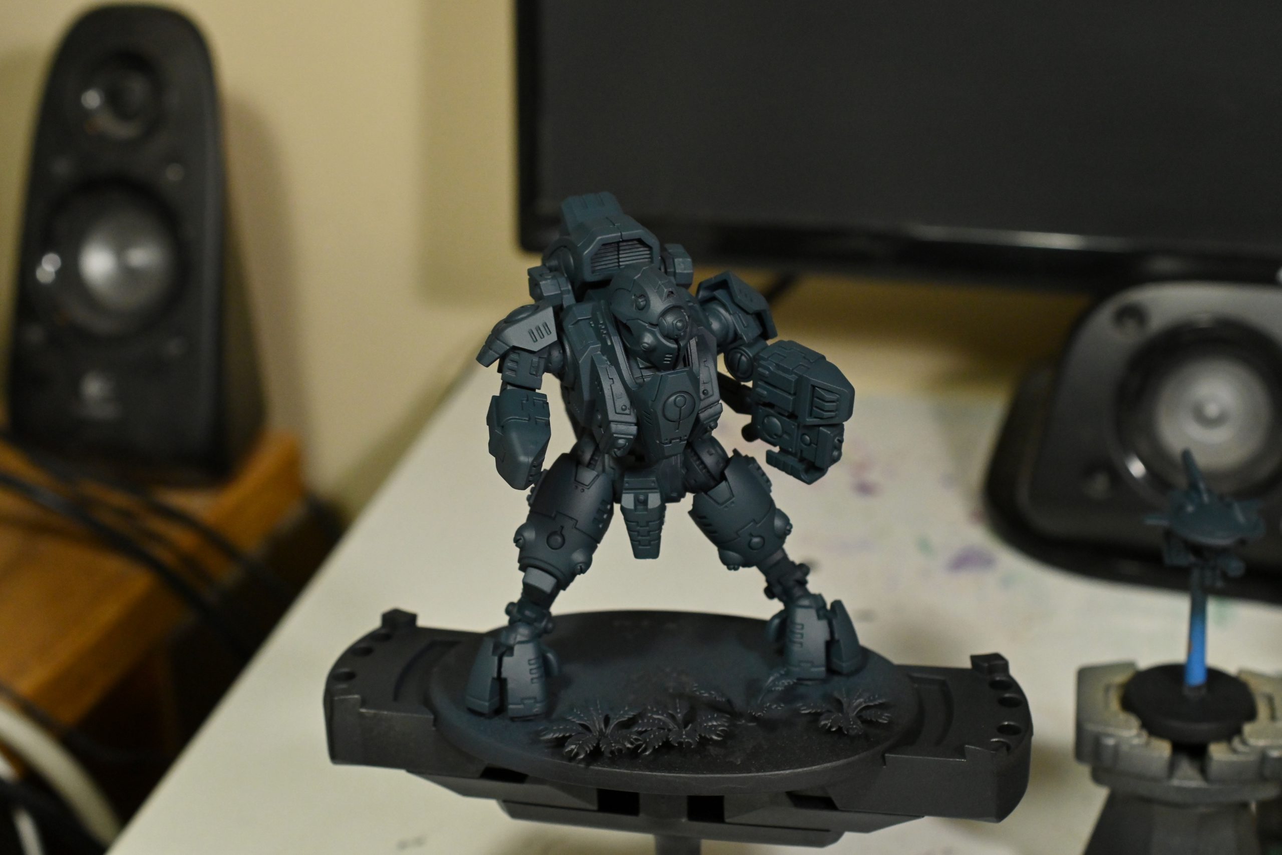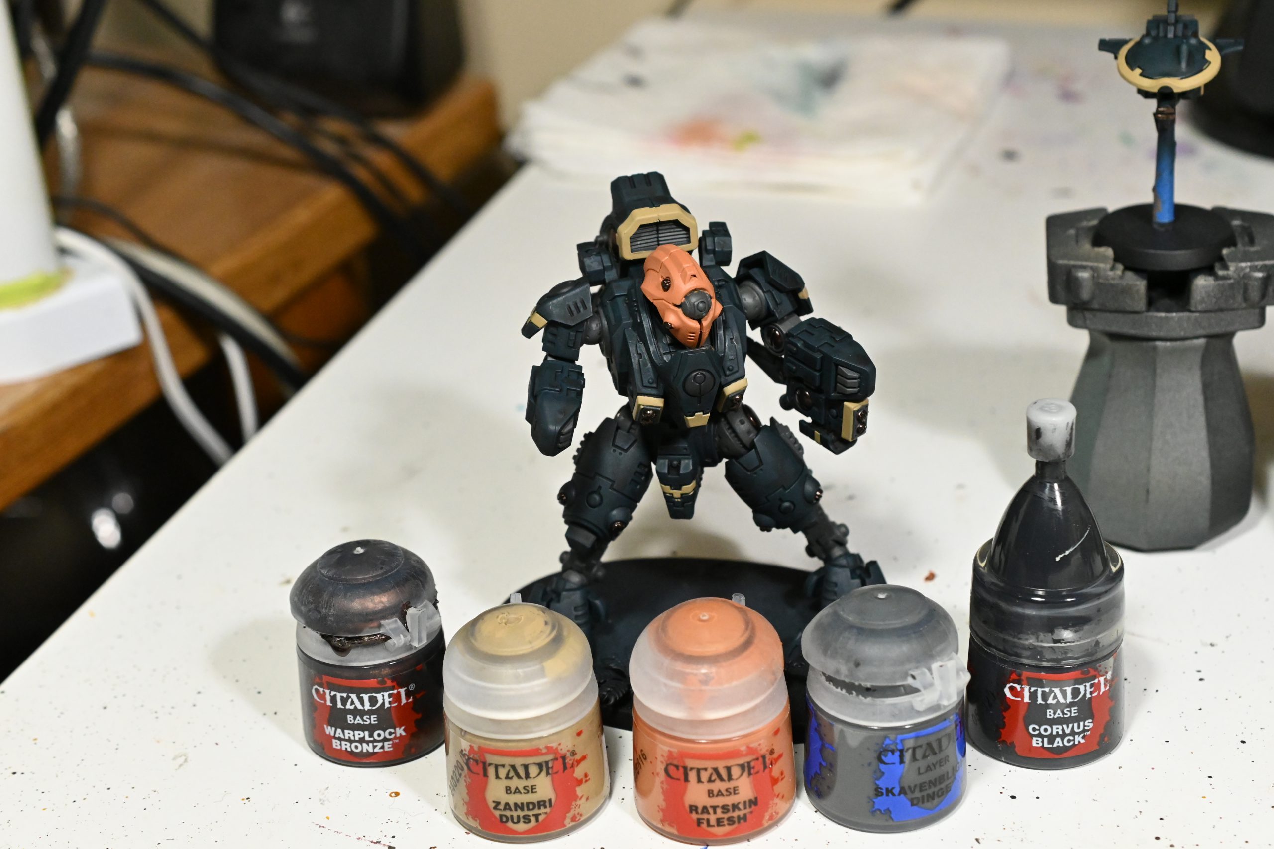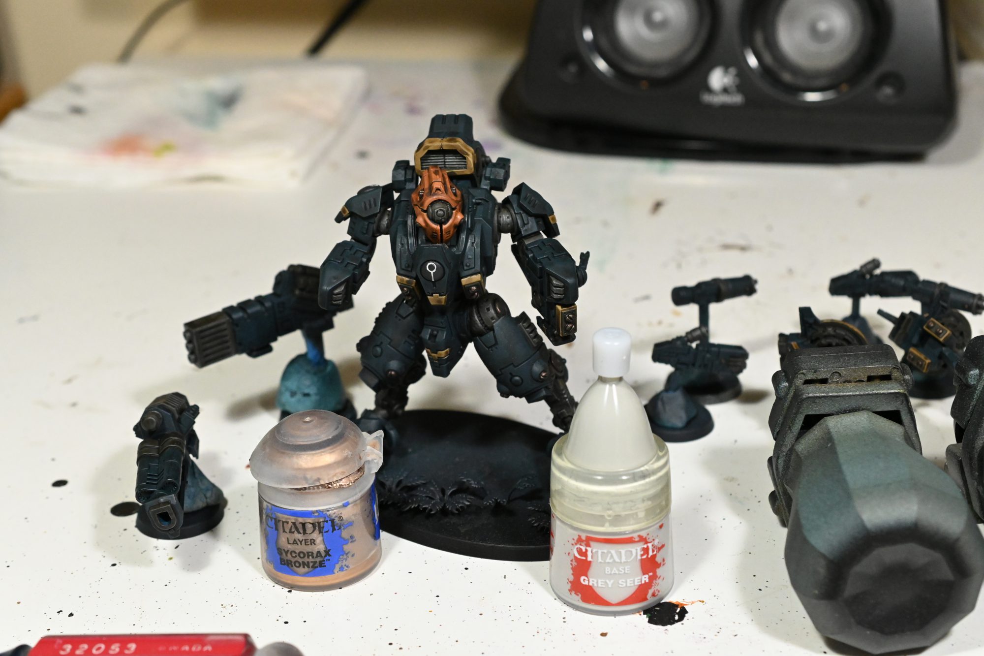 The glow I did is honestly the crudest part of the whole scheme, but tau have a absolute ton of it going on and anything more complex drives me insane. I do the colours in a slightly odd order, I start by covering the surrounding/illuminated surfaces in a fairly thin coat of genestealer purple, after that I water down the white a moderate amount and fill in the sources of illumination before going between the two colours with a band of Dechala. This helps hide mistakes with the purple or white and minimizes having to be precise with any given colour.