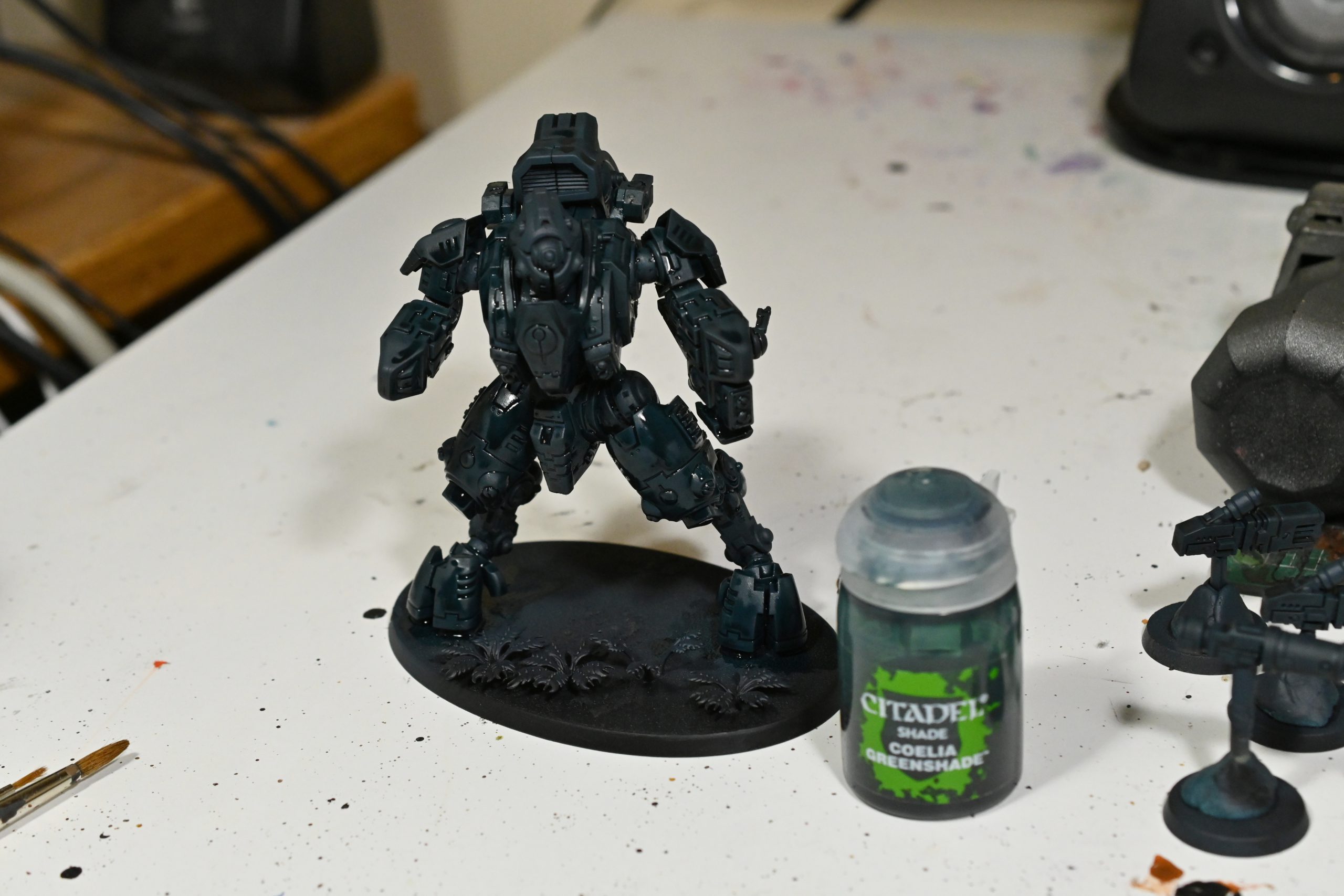 I start by airbrushing the model with Incubi Darkness and then washing it with Coelia Greenshade, after that we can pick out details starting with the Skavenblight Dinge under frame since other colours can some sometimes go over it. I don't really follow any lore stuff with my colour placement the Ratskin/Orange sept colour mostly just goes on the 'heads' of fancy units, and otherwise on the right vane of normal models. I like doing borders and some random little panels in Zandri dust to add some visual interest. I do the big gear-ey looking things in Warplock and then the Tau symbols get base coated with Corvus Black and the recess pinwashed with heavily thinned Pallid Wych, after that wash the other details with a heavy dose of Agrax.