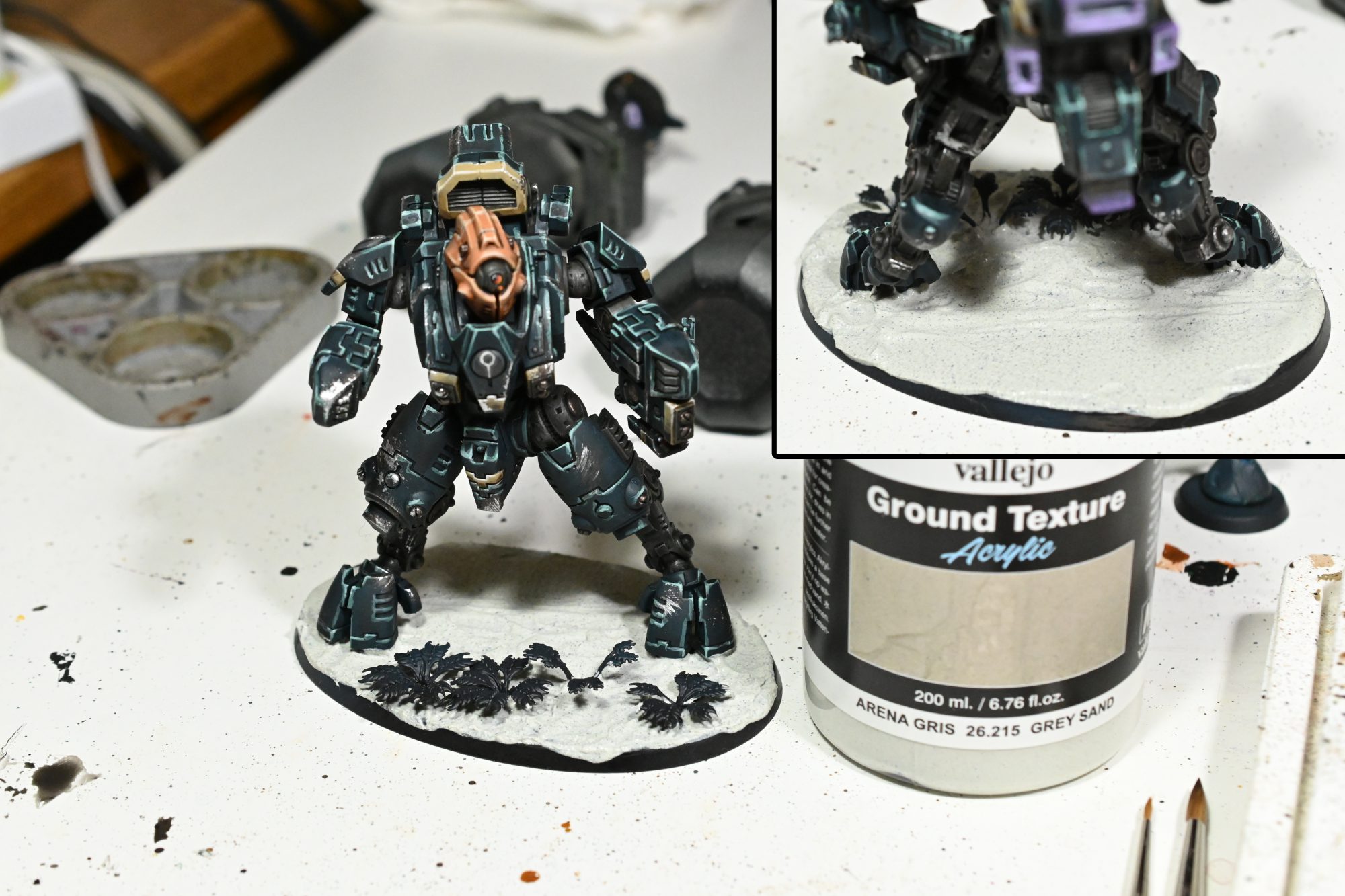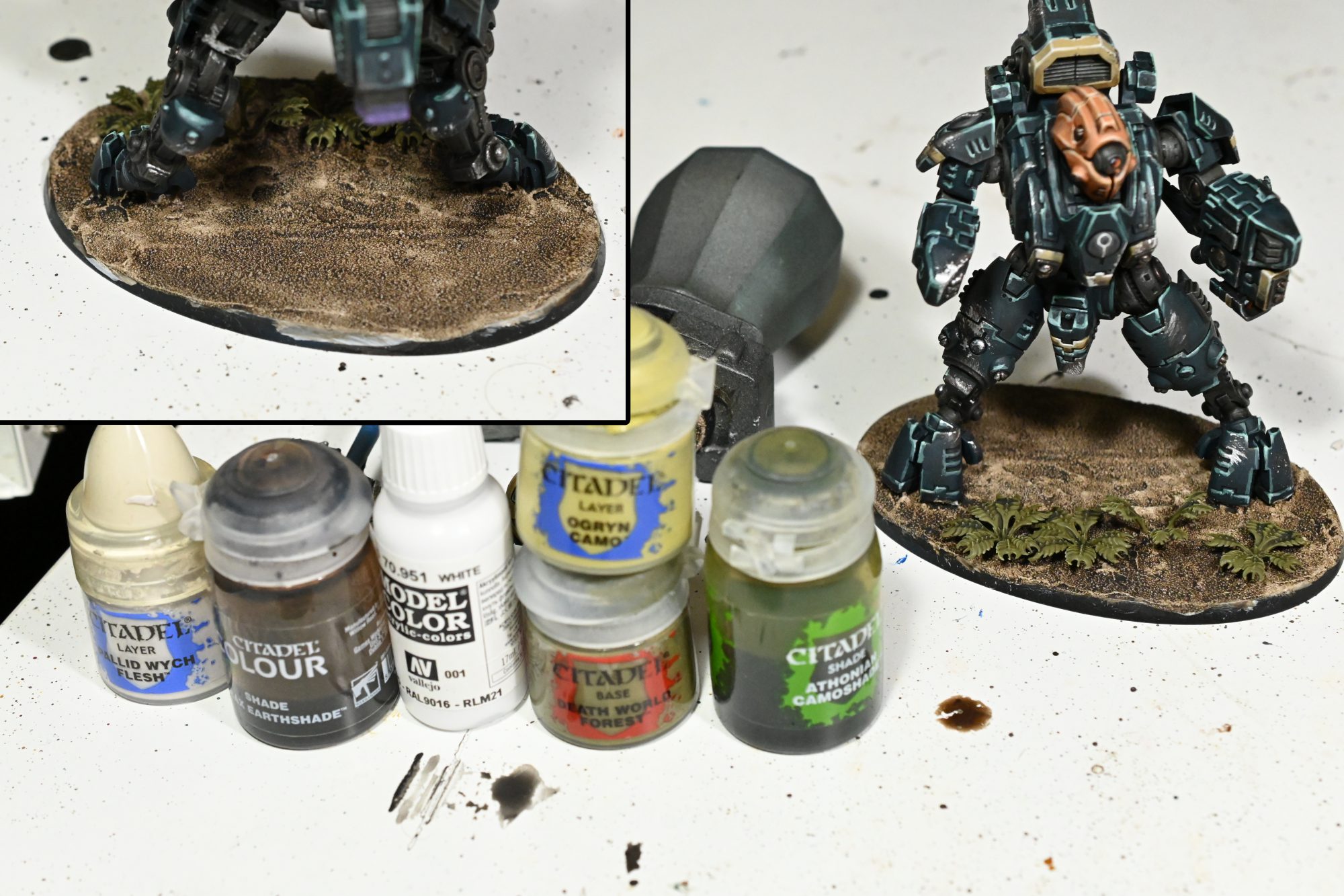 I start the base by covering it with Vallejo Grey Sand, being careful to smooth out where the ocean water will be in a bit. Once that dries I base coat the sand with a coat of Pallid Wych and the plants with Death World Forest, after that they get washed Agrax and Athonian respectively. Then its just drybrushing the sand with white and the plants with Ogryn Camo.