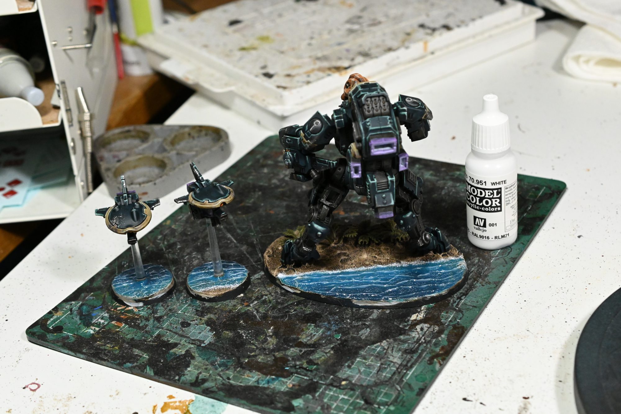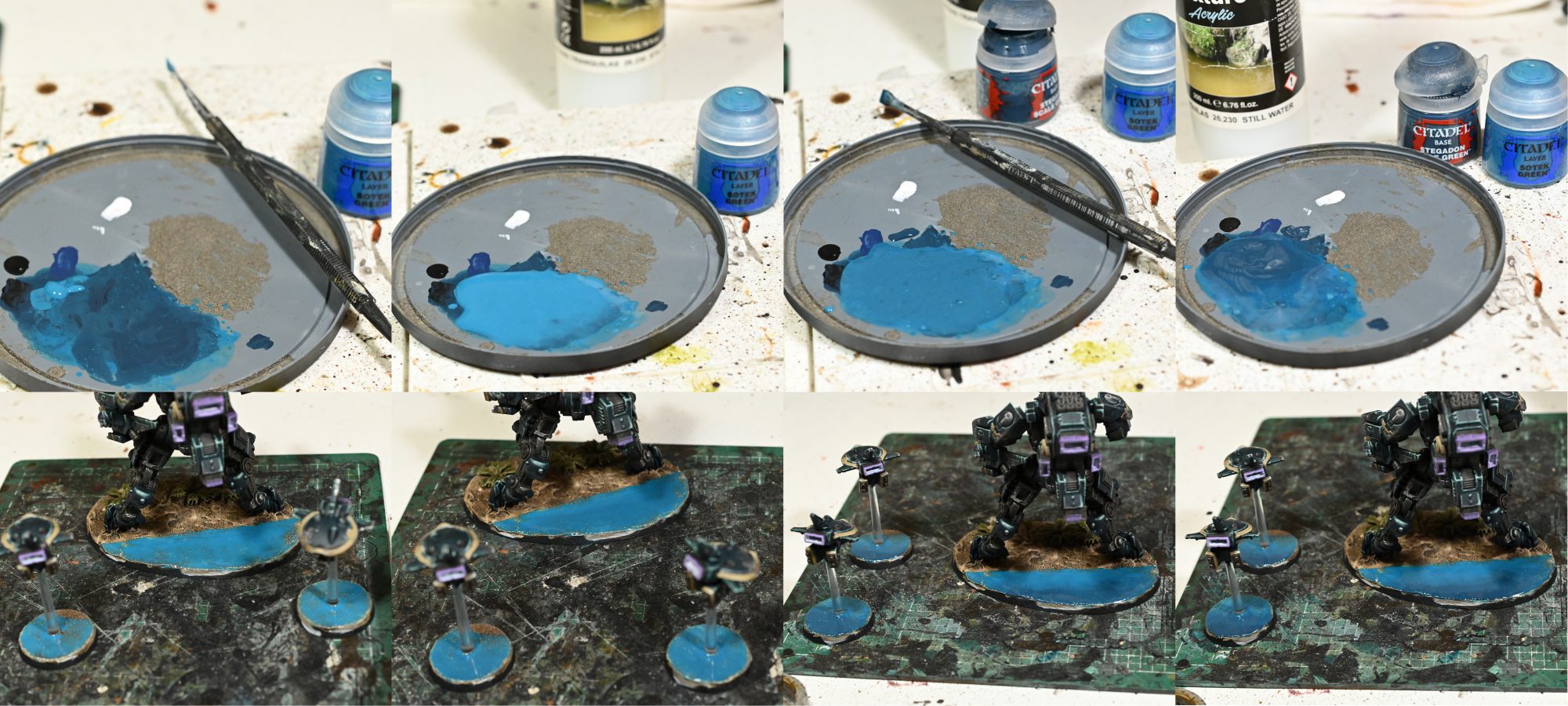 This step is simpler then it might look at first glance, I start by getting a good blob of Sotek onto a 'palette' before creating a big puddle of Vallejo Still Water, there should be enough sotek in the water to tint it pretty signifigantly but leave a hint of the beach beneath it. After that in as many steps as you have patience for introduce a bit of Stegadon to the water and create a gradient getting darker further away from the visible beach. This has a couple of interesting effects going on, the obvious thing is that the water gets darker which in of itself implies depth, but the other thing is that it gets more opaque which means the hint of beach beneath the waves fades away further reinforcing the perception of depth. Something you might notice once it dries is that there will still be a bit of texture from the paste underneath the water effects, this is just fine and will help imply smaller waves in the final base.