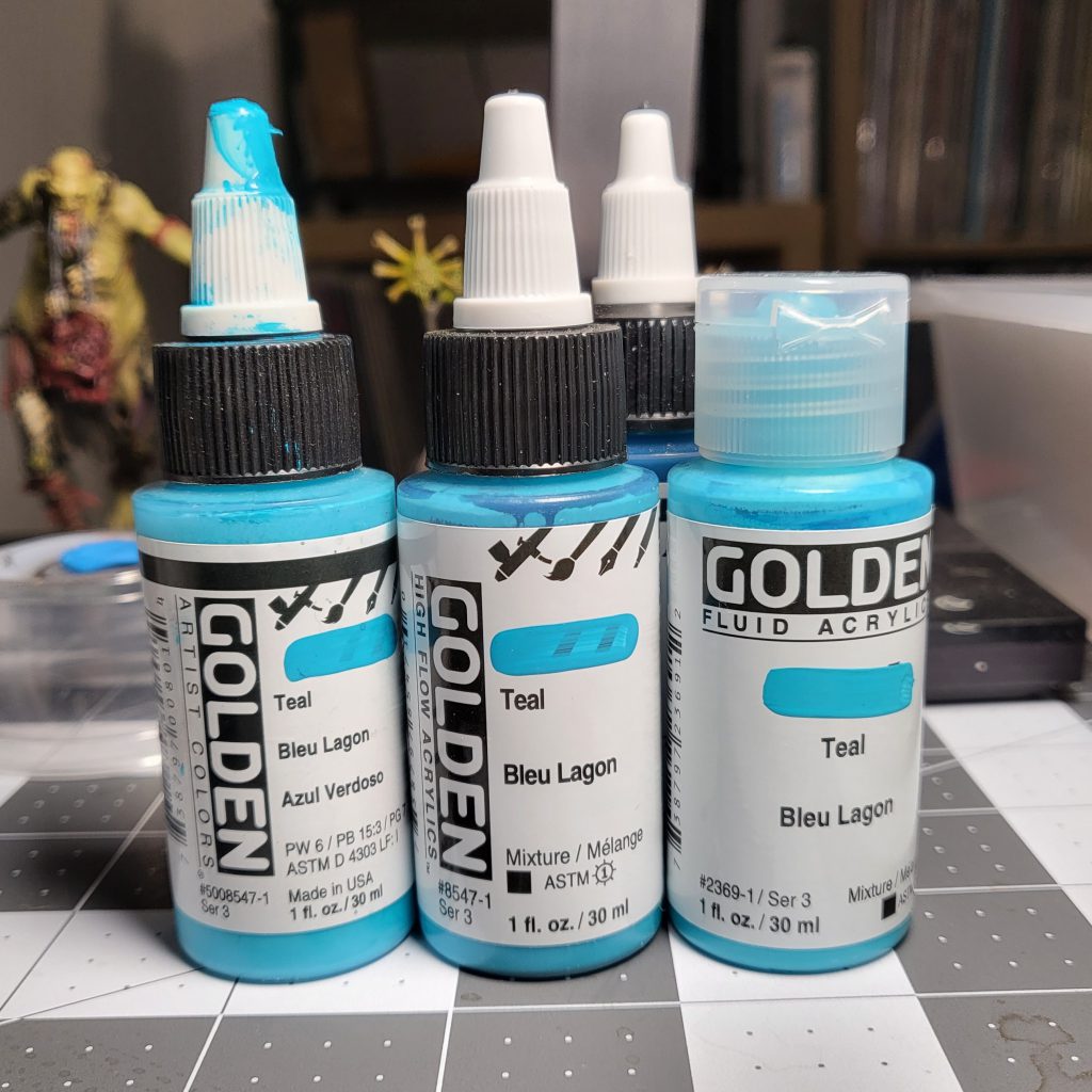 First, I start by priming black and going for a strong zenithal highlight. As I lean on a bunch of contrast paints, a zenithal highlight is helpful (but not required here). The teal works best over a light prime, so any white primer is solid. Obviously, the main color is Golden High Flow Acrylic Teal. If you've never used their high flow paints before, keep in mind that there is a solid amount of drying retarder in the paint, which means a MUCH longer drying time. Don't handle any painted bits for a while! Like I mentioned before, I mix up some teal and white to add a bit of definition, with some messy highlights and drybrushing. If you want to stick with GW paints, Temple Guard and the colors in that orbit are great.