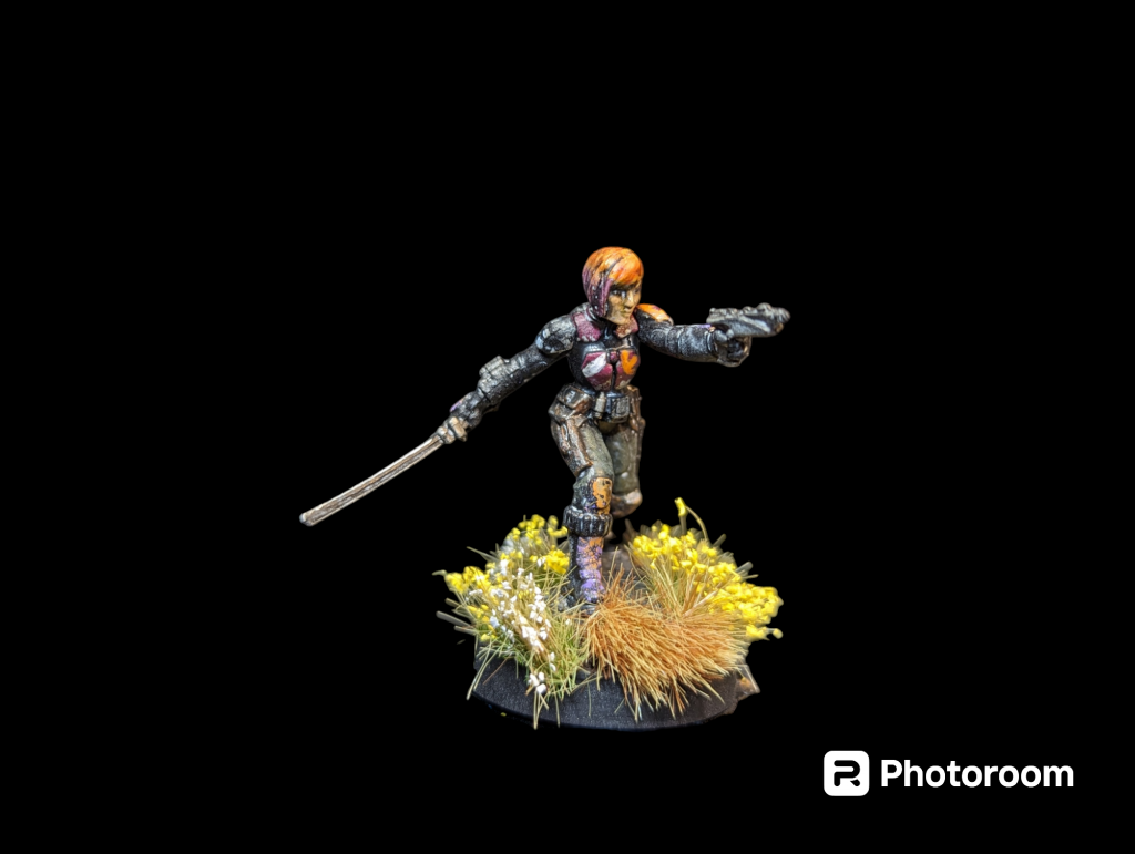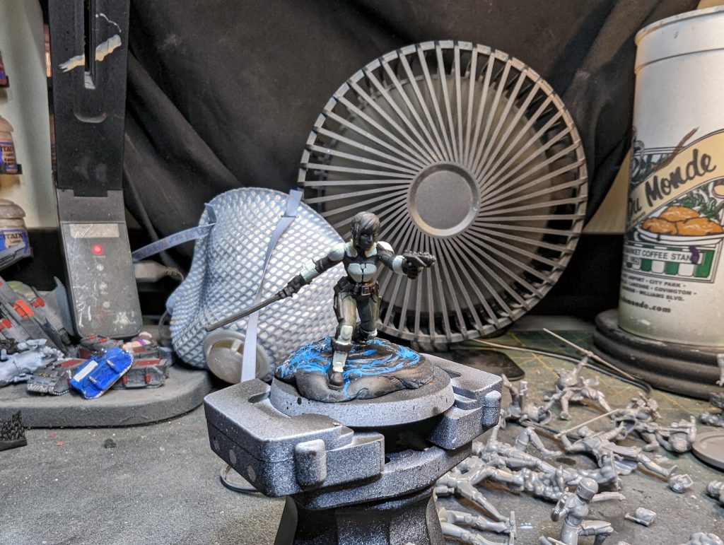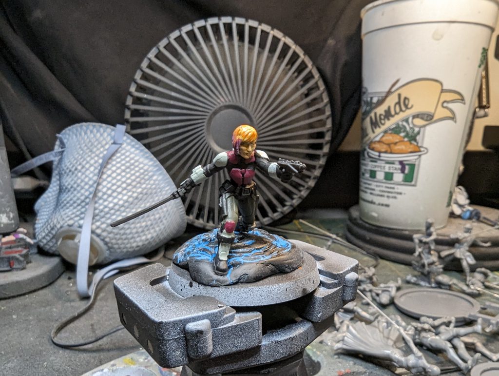 Thank goodness for my magnifiers. This was my first real attempt at any kind of freehand on any model I have ever painted, and it wouldn’t have been possible without my magnifiers. I started by just lining off the checks on her should, filling in spots with white and black ink, and then cleaning it up afterwards. For the symbol of the rebellion, I just gave the IMPRESSION of the symbol. Up close it doesn’t look great, but from three feet you can tell what it’s supposed to be. The same is true of her left shoulder pad. It also really helps that the painting on her armor (in the show) is very clearly hand-done, which allows for imperfections in the freehand work. Freehand Checks: Black Ink, Pro Acryl Bold Titanium White; Freehand Rebellion Symbol: Games Workshop Fire Dragon Orange, Army Painter Safety Orange; Freehand Stripe: Pro Acryl Bold Titanium White