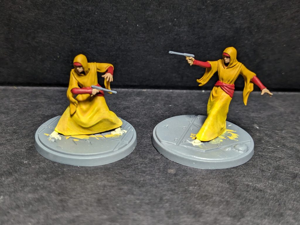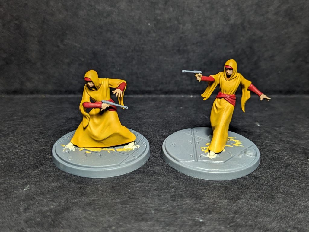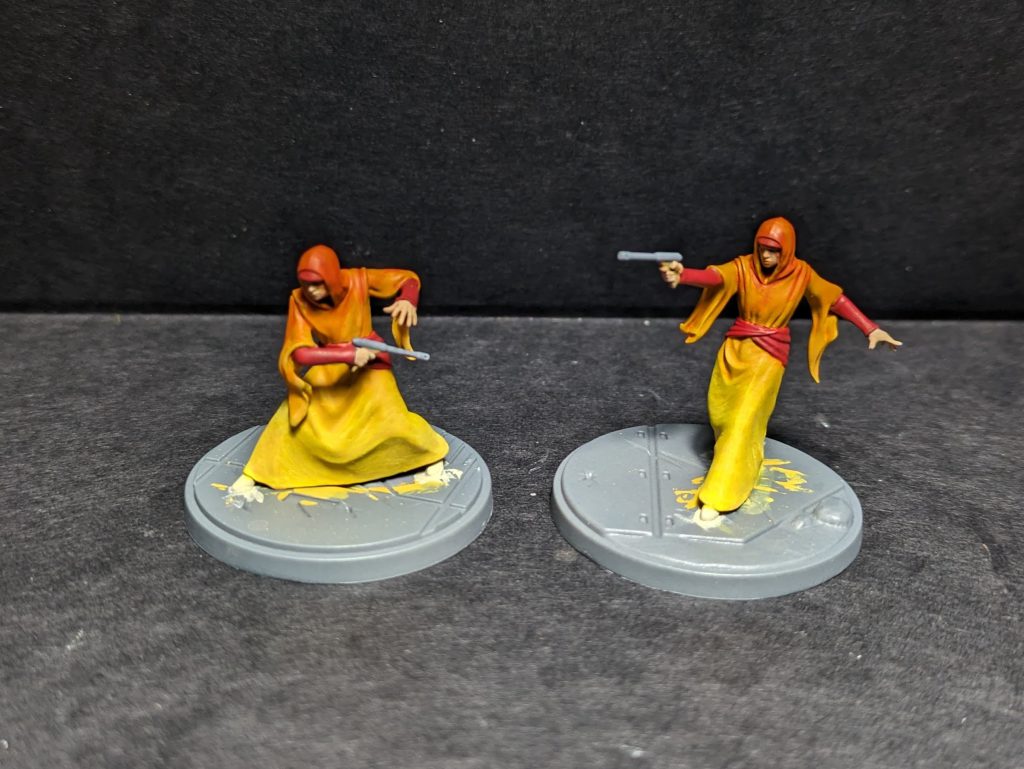 The rest of the models gets similar work to Padme and Sabe: the red robe recipe we used on both on the armour and sash; the same gun recipe; the skin tone recipe (but not doing the makeup and keeping it more naturalistic all over). All done and based, the handmaidens are ready to protect their queen!