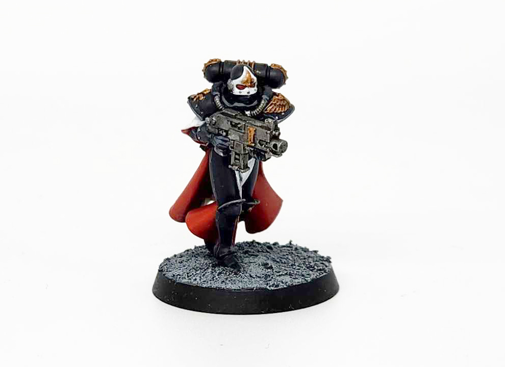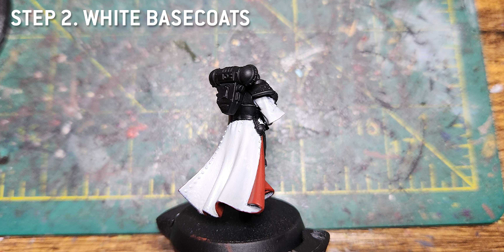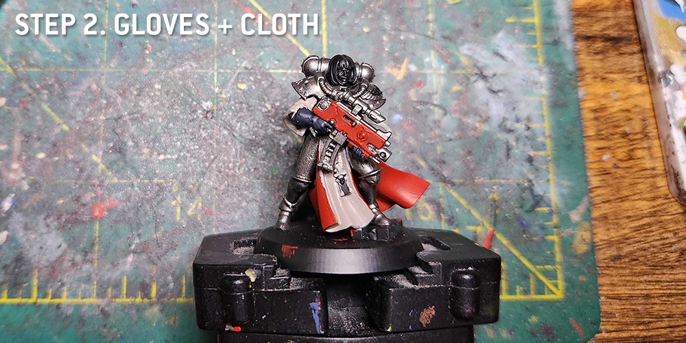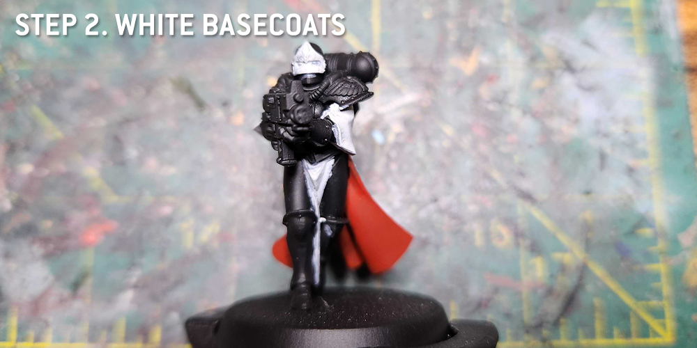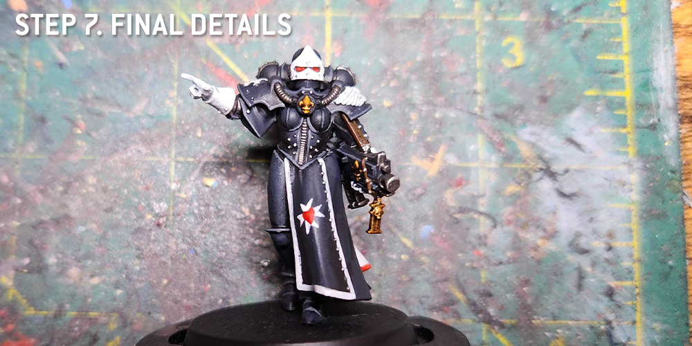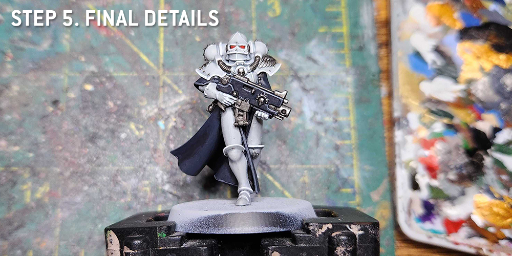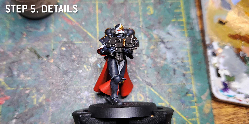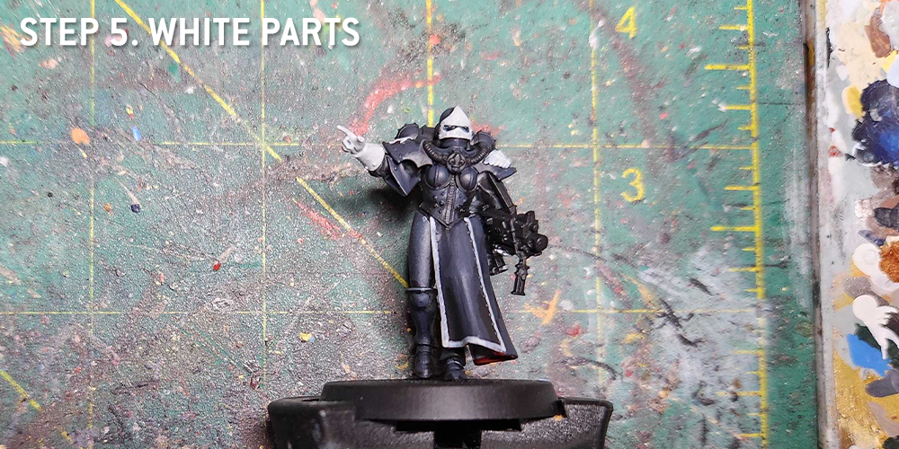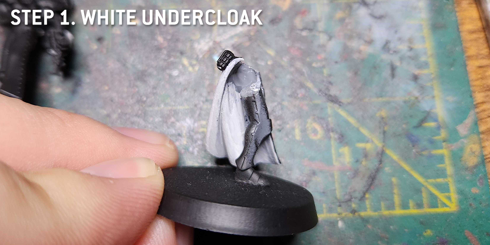 At this point I also do more of the white parts - the Gloves, Helmet Visor, and icons are all painted with Grey Seer. I also use Grey Seer to paint the line around the edge of the black cloak.