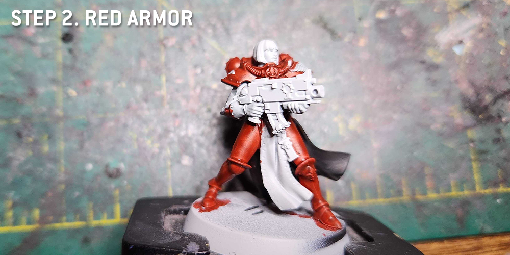 I start by painting the undercloak areas with Mephiston Red, and while I'm at it I Paint the bolter. Then I hit the armor with Leadbelcher.