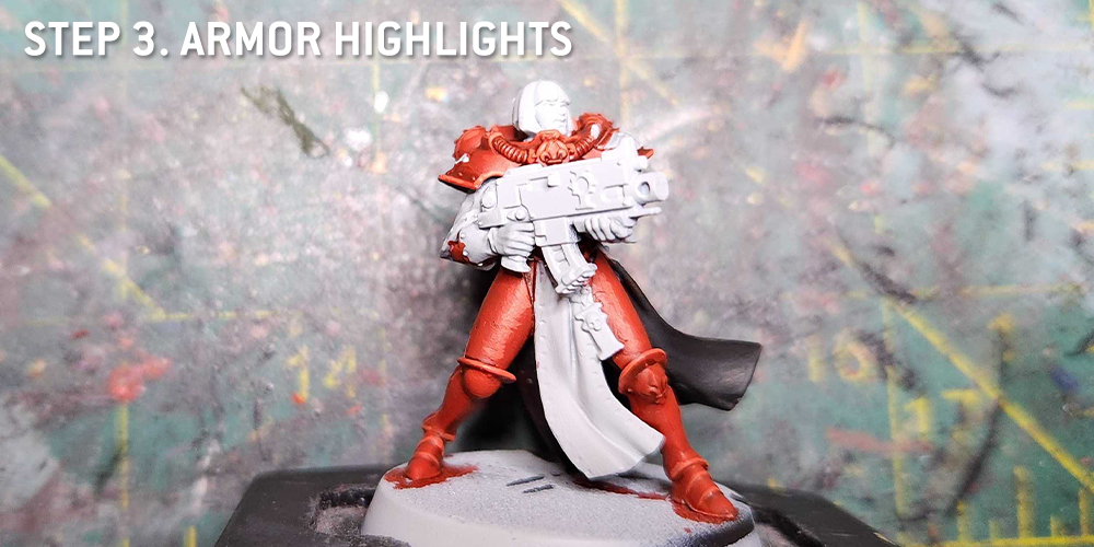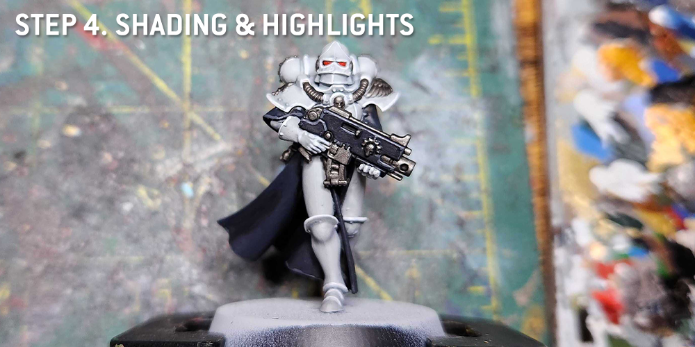 I'll use Apothecary White to shade key parts of the white Armor, like just under the helmet visor and under the rounded kneepads, then I come back and clean that up with Grey Seer and do an edge highlight with Reaper Pure White.