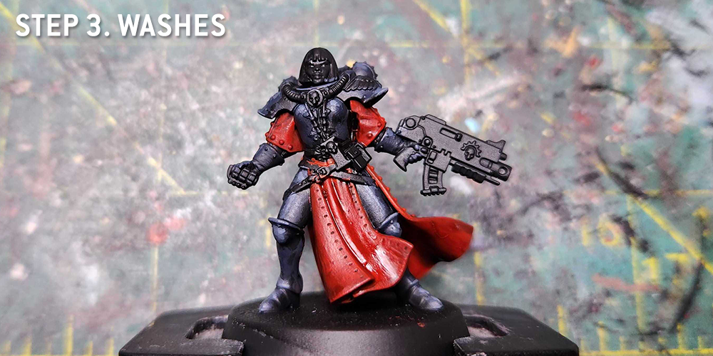 I wash the red cloth parts with Carroburg Crimson, usually doing 2-3 coats in the recessed parts to create some nice shading in the folds. I'll also do a little bit of shading on the black armor with Nuln Oil.