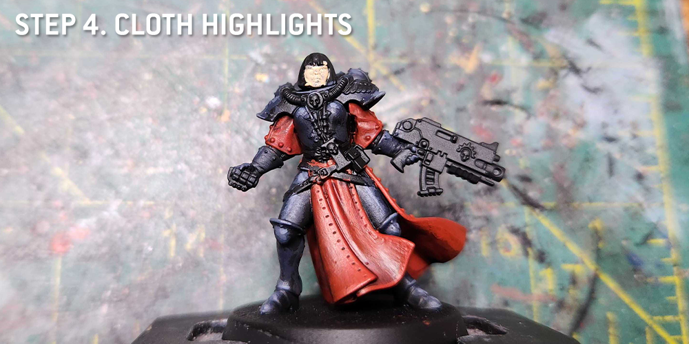 I come back and paint the raised parts of the cloth with Mephiston Red, and I'll edge highlight the cloth with Evil Sunz Scarlet, hitting the tops of folds. This is also when I painted the face, using Kislev Flesh.