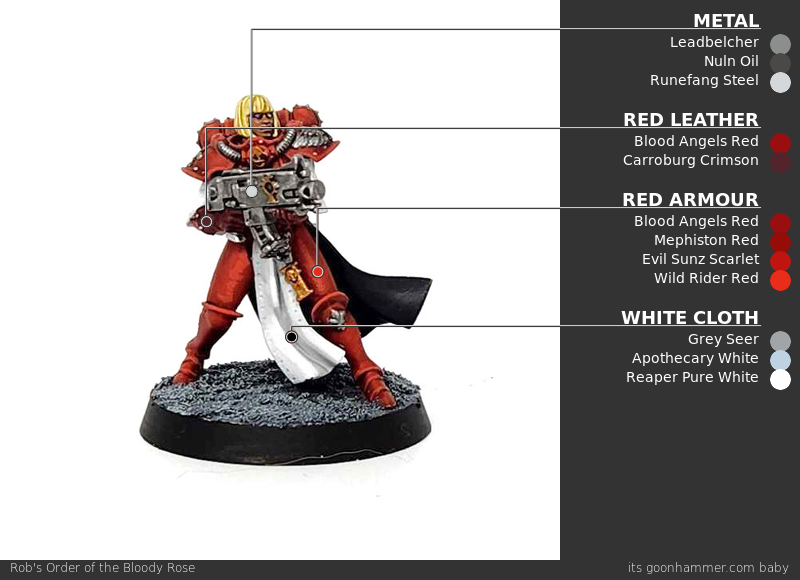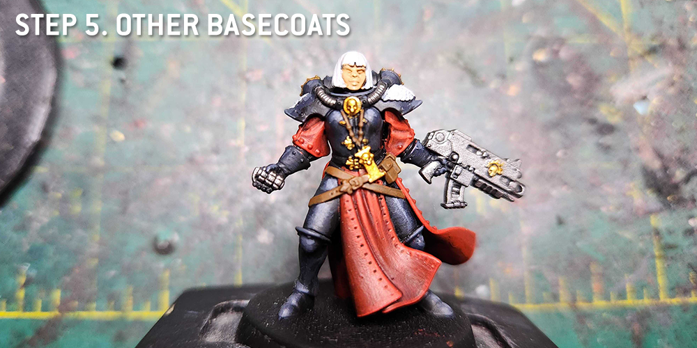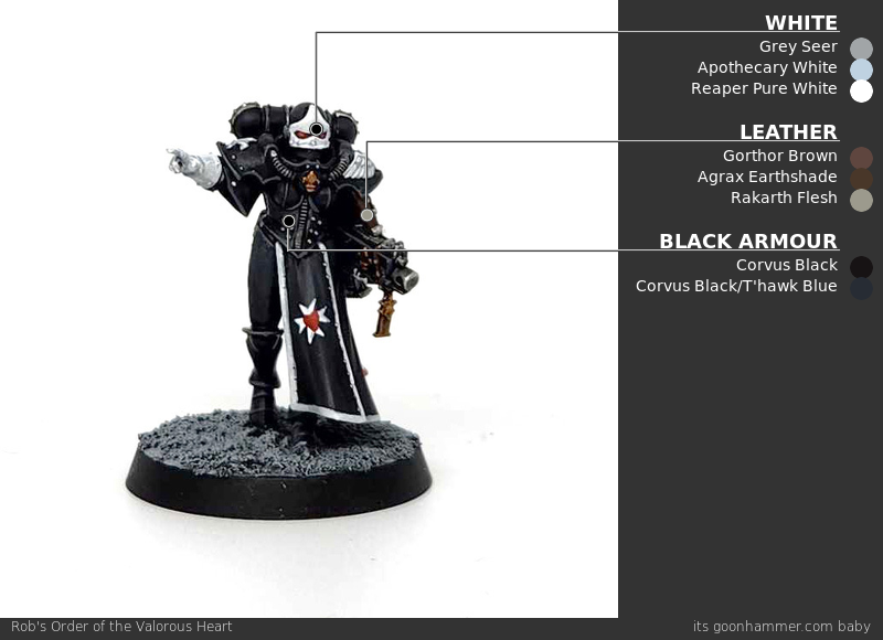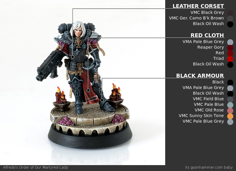- The primary basecoats here are black and red. For the black I primed black and then did targeted highlighting with Vallejo Air Blue Grey. This gave me a nice off-black that I could shade down to black and highlight up nicely. For the red bits, I first brush base-coated with Vallejo Blue Grey Pale to get a solid off white before then apply Vallejo Red. Doing the red directly over the black would take a lot longer. All of the white is that same Vallejo Blue Grey Pale. The leather bodice is a mixture of Vallejo Grey Black and German Camouflage Black Brown to get a nice off-black that has some brown in it to sell the look of leather and contrast from the ceramite armor.