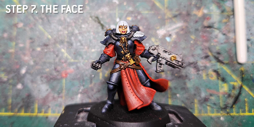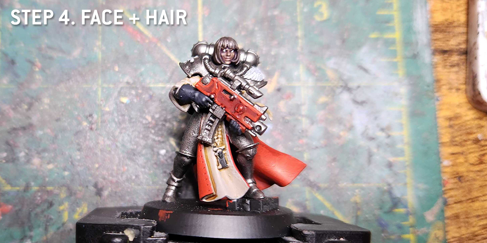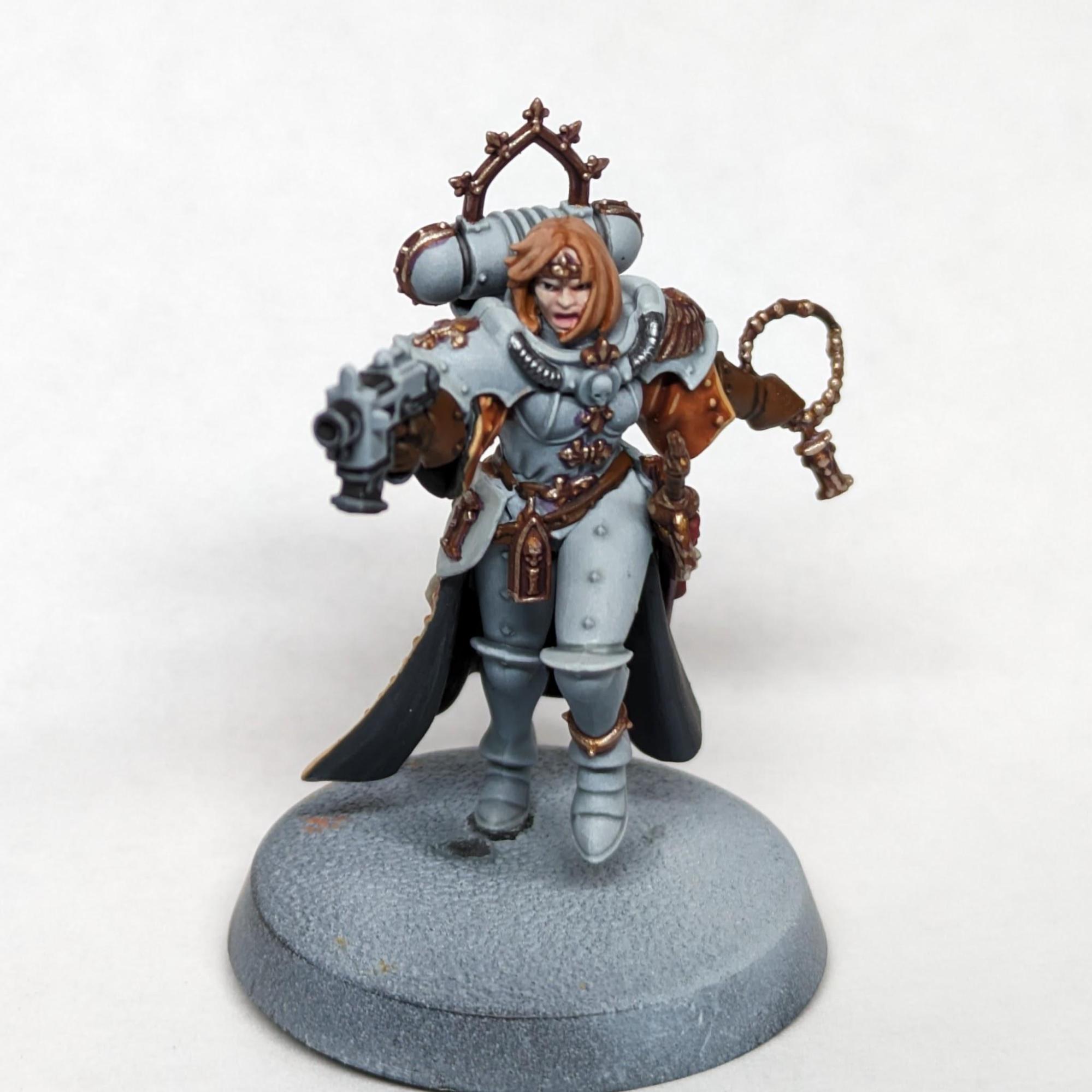 Paint the face, hair, flour de lis, visors on helmeted Sisters and raised parts of the armour in Eshin Grey.