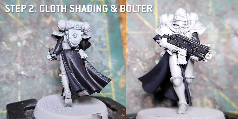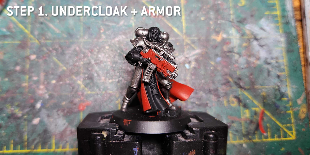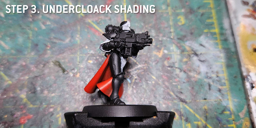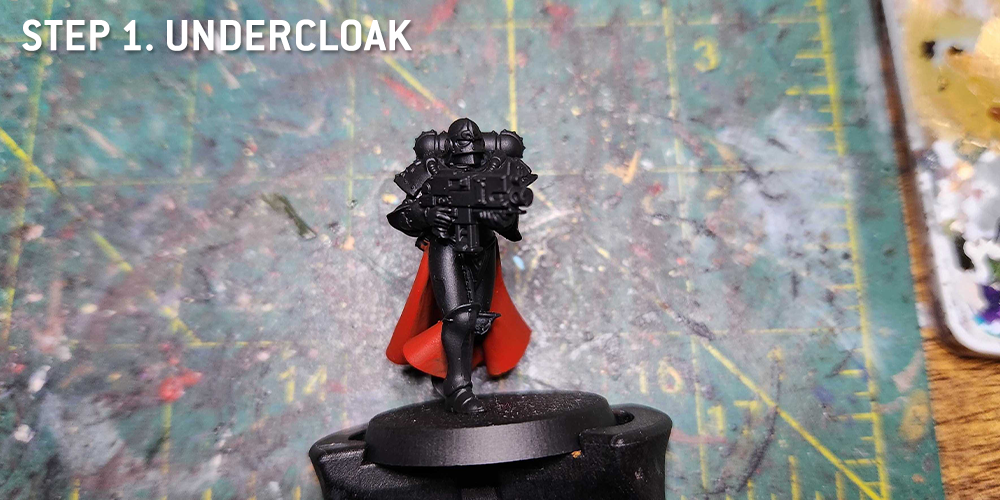 I start with the undercloak as usual, but hit all of the black parts with a few coats of Black Legion Contrast.