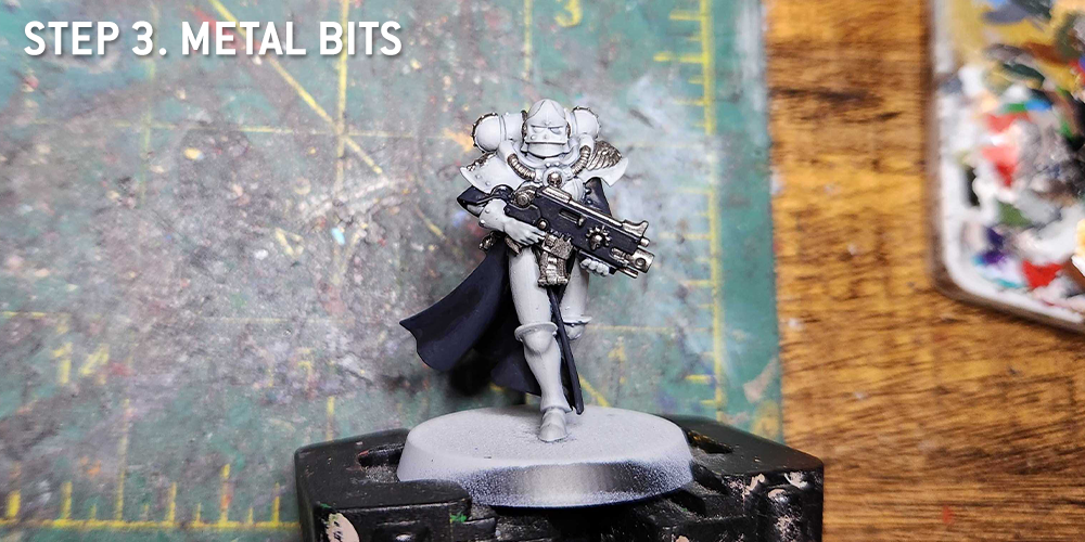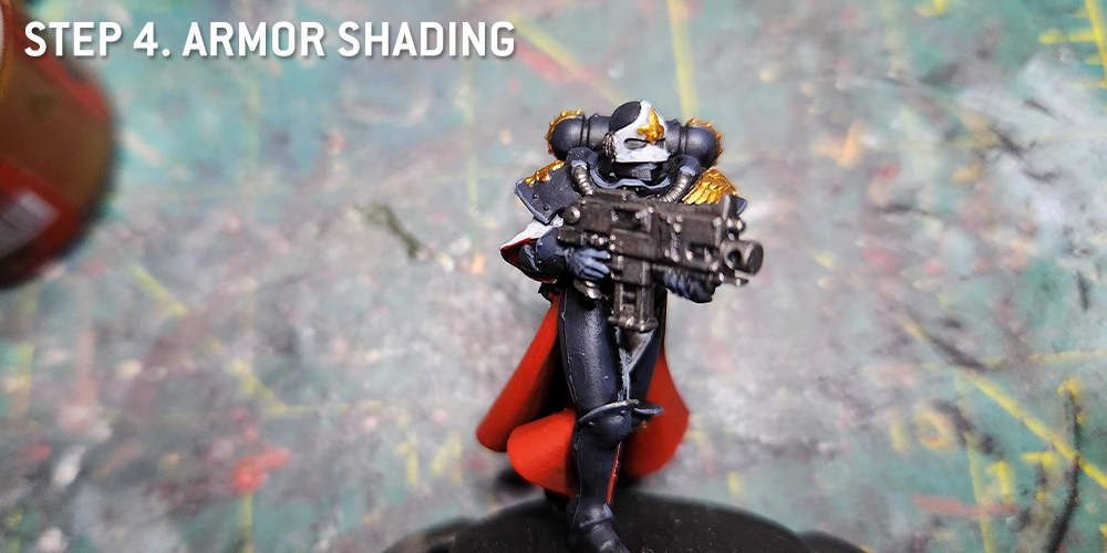 Paint a few dots of white on the shiniest parts of the black armour e.g. Toe caps, knuckles, centre of knees and so on.