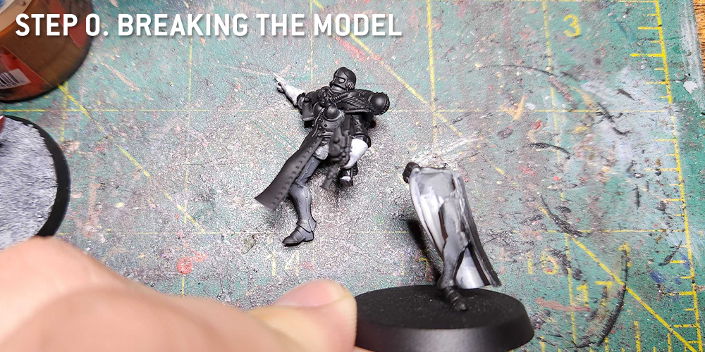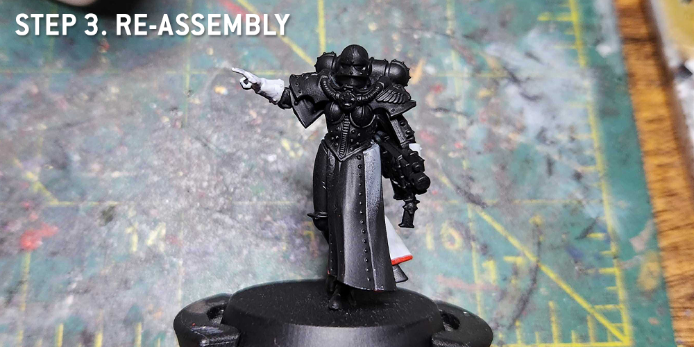 - Like with any model, the first consideration is assembly. In this case, since the head is unarmored and going to be light (skin and white hair) contrasting black armor, I wanted to keep those separate and prime them in different colors. I kept the backpack off so I could get at the details on her back that no one would ever see. And again, in order to airbrush the base separately, I kept the model unglued from the base when priming.