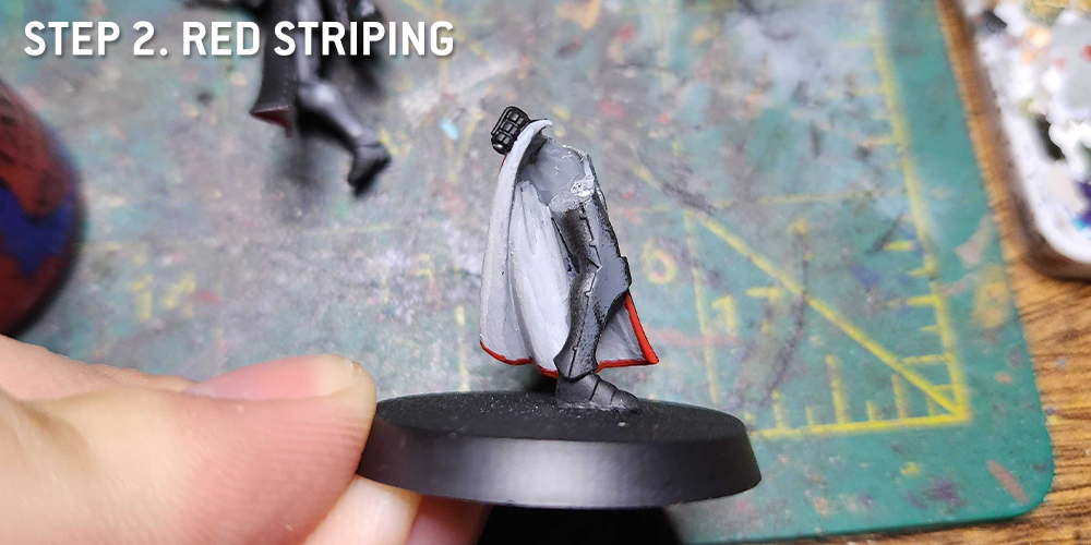 To draw the cloak details, I marked a straight line around the edge where I wanted the decoration to go with a pencil first. At the bottom of the red skirt, I used Pallid Wych Flesh for the line, and inner cloak is done with black and Mephiston Red.