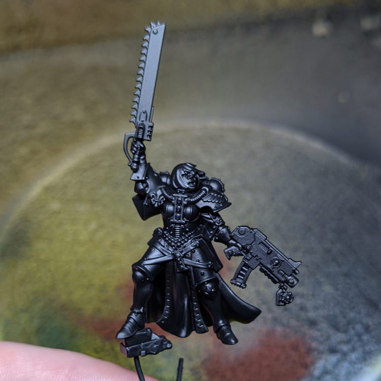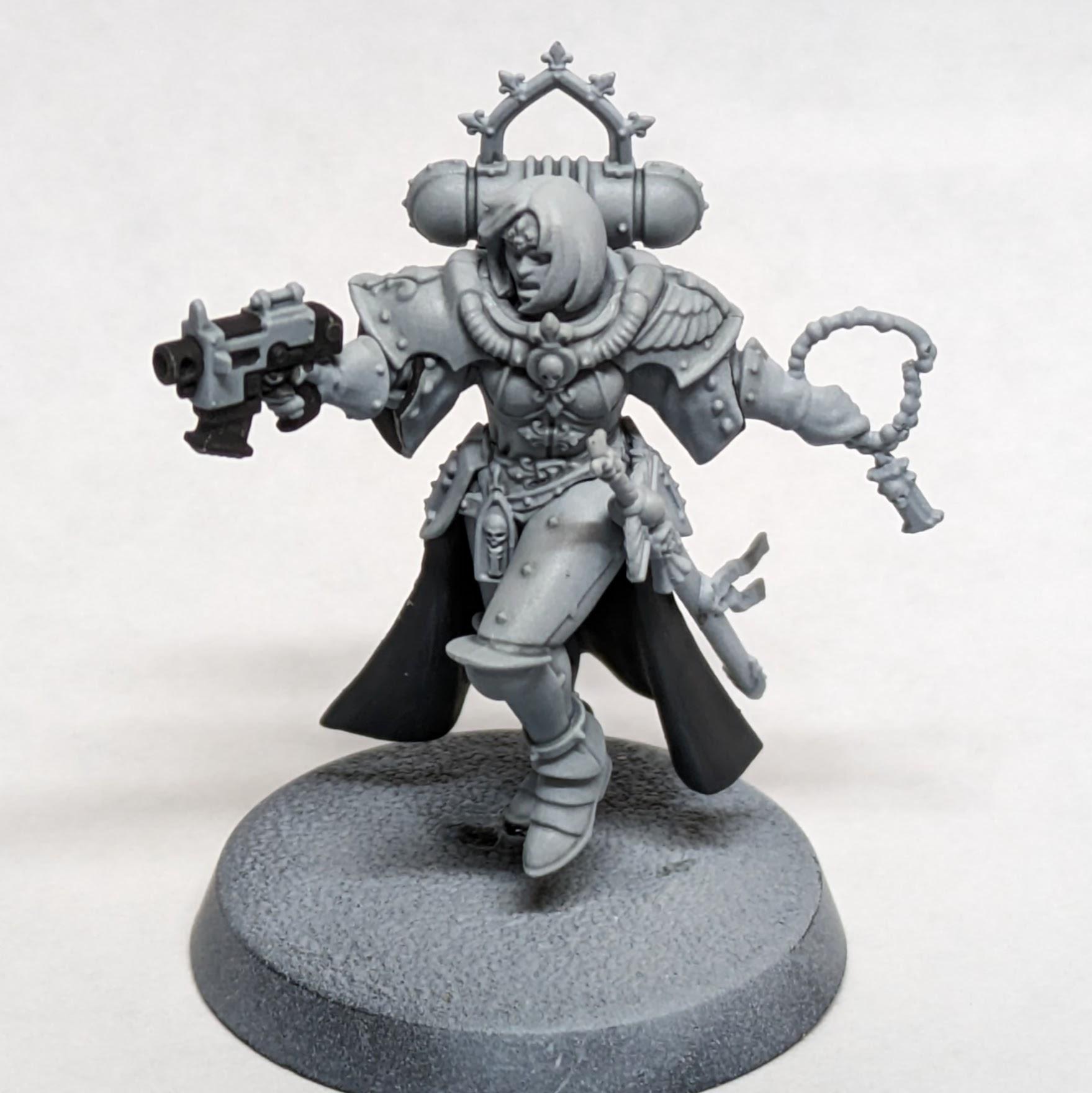 The Valorous Heart aren't the most visually interesting of the canon Sisters Orders, but they do have some fun quirks. Their most distinct visual feature is the lining on their cloaks, which makes them a bit more work to paint. I started by priming this model black, but then had to break it apart to reach the underside of the cloak.
