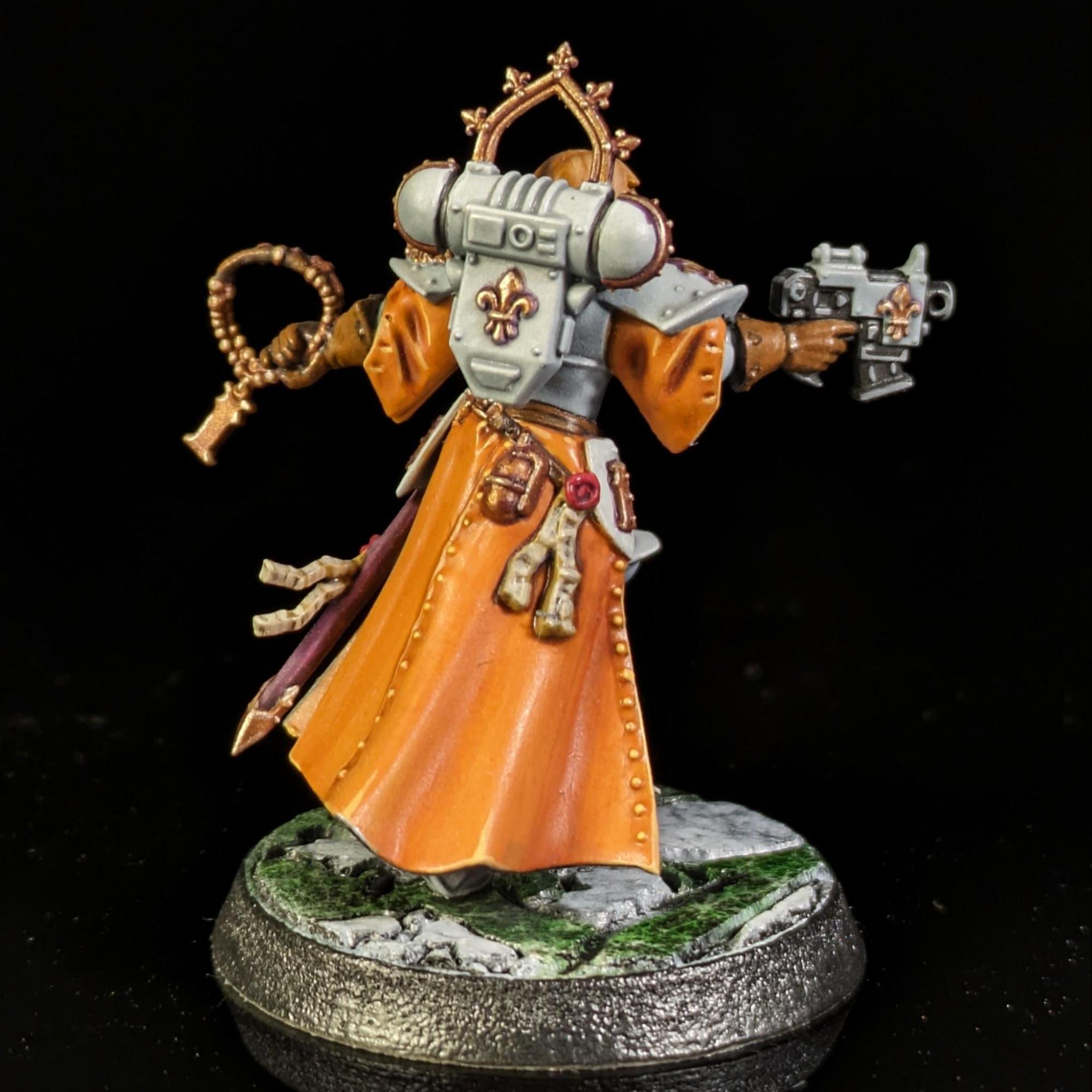 - Techniques for painting common elements of the Adepta Sororitas, such as purity seals, power weapons, and flames.