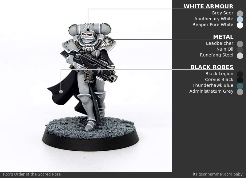 The Order of the Sacred Rose offer a major departure from the more standard Sisters schemes. Oh they still use red, white, and black, but the difference here is the white armor. White armor is tricky; it's hard to shade and highlight well and so my cheat is that I almost never actually paint things white. Instead I opt for an off-white, which allows me to both shade and highlight the model more easily (I can edge highlight with white) and is easier to lay down as off-whites usually have better consistency. On top of that, when you put off-white next to black like we will on this model, it will look all the brighter.