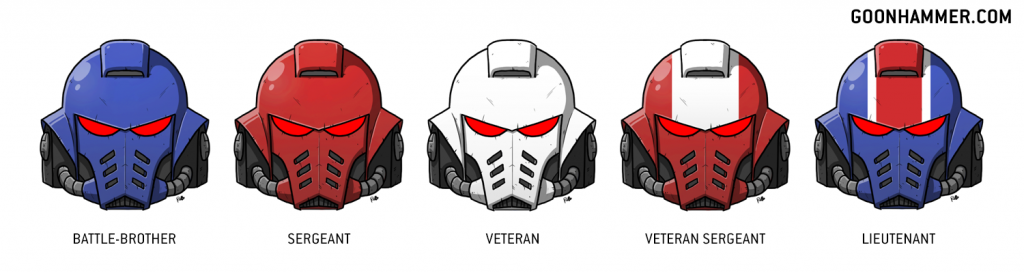Also note that whether a chapter follows these often has as much to do with the chapter's color scheme as it does their adherence to the Codex Astartes - it doesn't make a ton of sense for Blood Angels to mark sergeants with red helmets, for example.