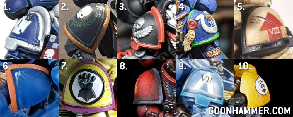 Note that the last color there is just the standard Ultramarines blue - the 10th company is the scout company, and doesn't tend to actually use trim on their shoulder pads, nor a color for it.