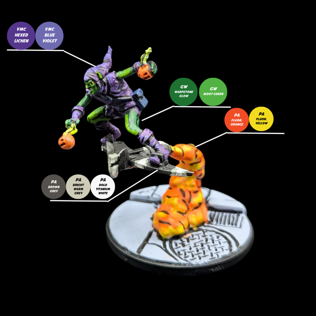 For the iconic skin tone of the Green Goblin, i basecoated all of it in Games Workshop Warpstone Glow and then sketched in highlights with GW Moot Green.