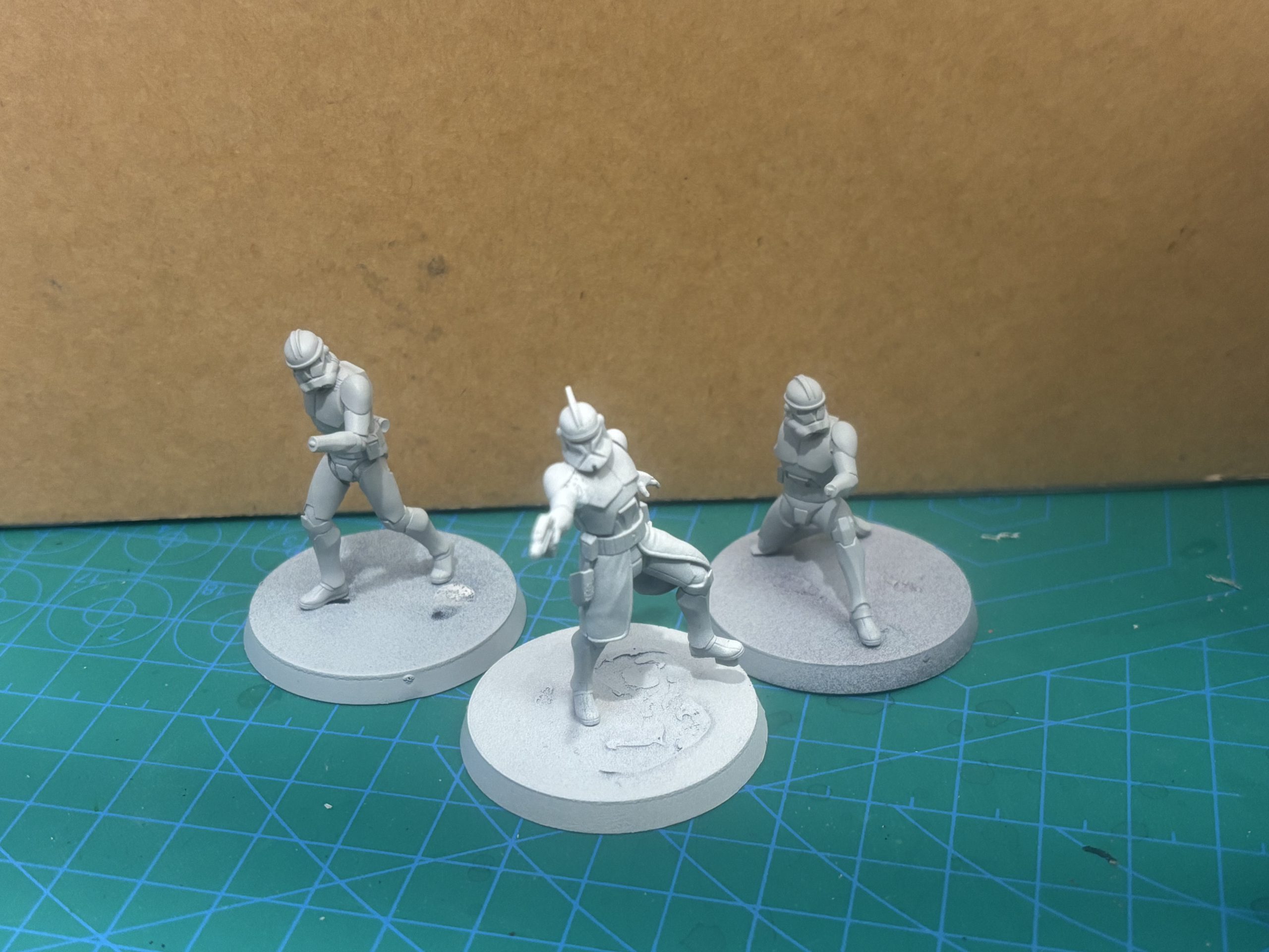 Step Zero: This is as good a time as any to point out that I paint all my Shatterpoint models stuck with just a touch of superglue on extra 40mm GW bases so that I can paint their bases without the models in the way, and vice-versa. When the project is done, you just gently pop them off the painting base and pin them to the Shatterpoint base through the foot using “won’t frost” superglue. I also generally paint my Shatterpoint models’ arms separately if they impede access to the body, as you can see on the models below. I find this both speeds and really simplifies the stress of the process- though you do have to be careful about not wearing paint off through handling. (The astute amongst you will notice these models are actually Commander Ponds and the Wolfpack, none of whom come in the Hello There! box, but they were the only unpainted clone troopers I had that I could use for this step-by-step! Rest assured, I painted Commander Cody and his 212th using this method as well.)